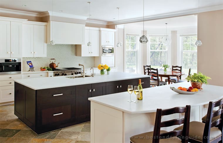 For a Weston home, Scandia Kitchens also employed the double island strategy, as well as a good many other amenities, when crafting this aesthetically pleasing, workable kitchen. The transitional space is rife with clean-lined frameless cabinetry and contains a dark island with a sink near the Wolf range for utilitarian needs (think dishwasher, trash, recycling, etc.), as well as a white one with a curved quartz counter for entertaining.