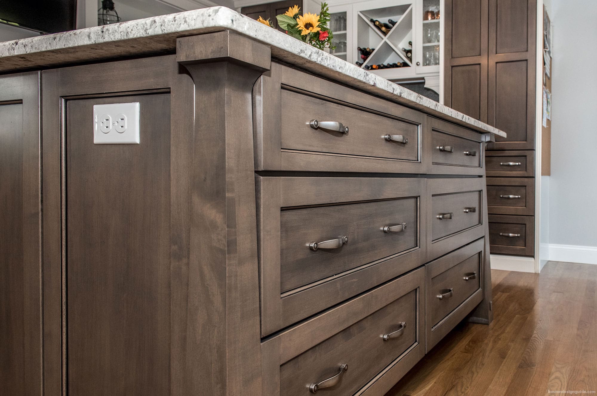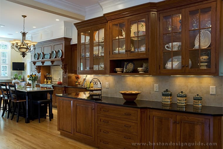 In today’s sea of white palettes, this rich cherry kitchen by Scandia Kitchens is a standout for its timeless warmth and traditional framed inset cabinetry. Part of a 5,000-square-foot addition in Medfield, this open concept layout flows seamlessly from the kitchen into the dining area, incorporating a beautiful oversized hutch into the mix and culminating in a striking bar area finished in antiqued black paint.