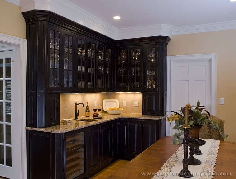 To tie it in with the kitchen and give the homeowners additional storage, Scandia Kitchens wrapped the hutch around the corner, explains Designer and Showroom Manager Colleen Lord. They also opted for a black kitchen island with a granite countertop to echo the hutch’s surface and the dramatic black bar in the adjoining space.