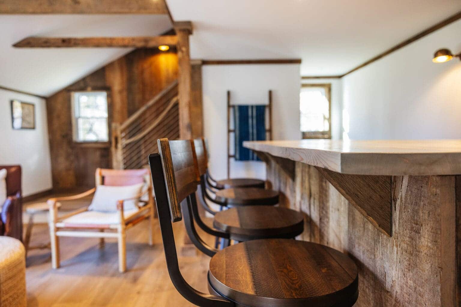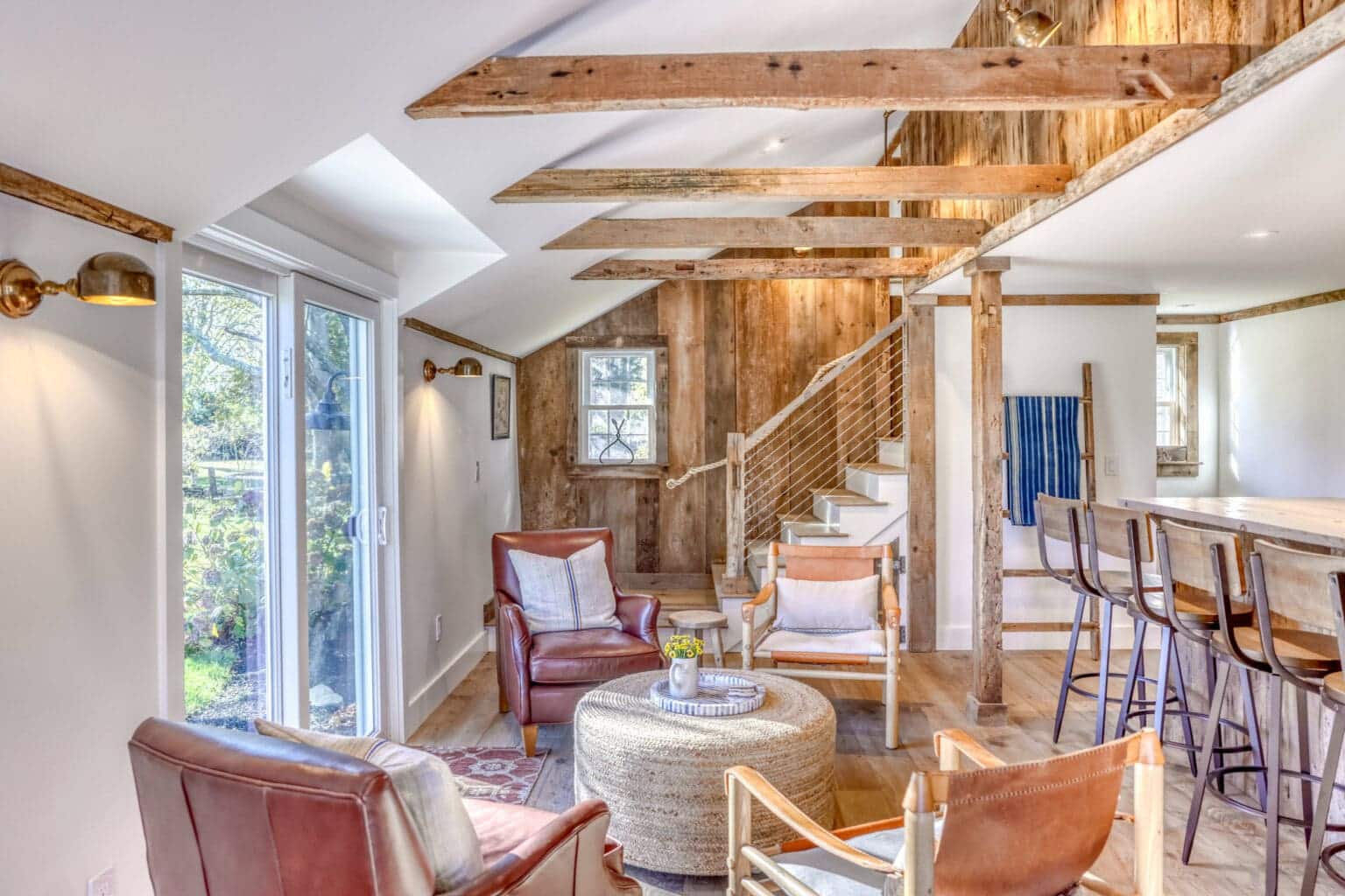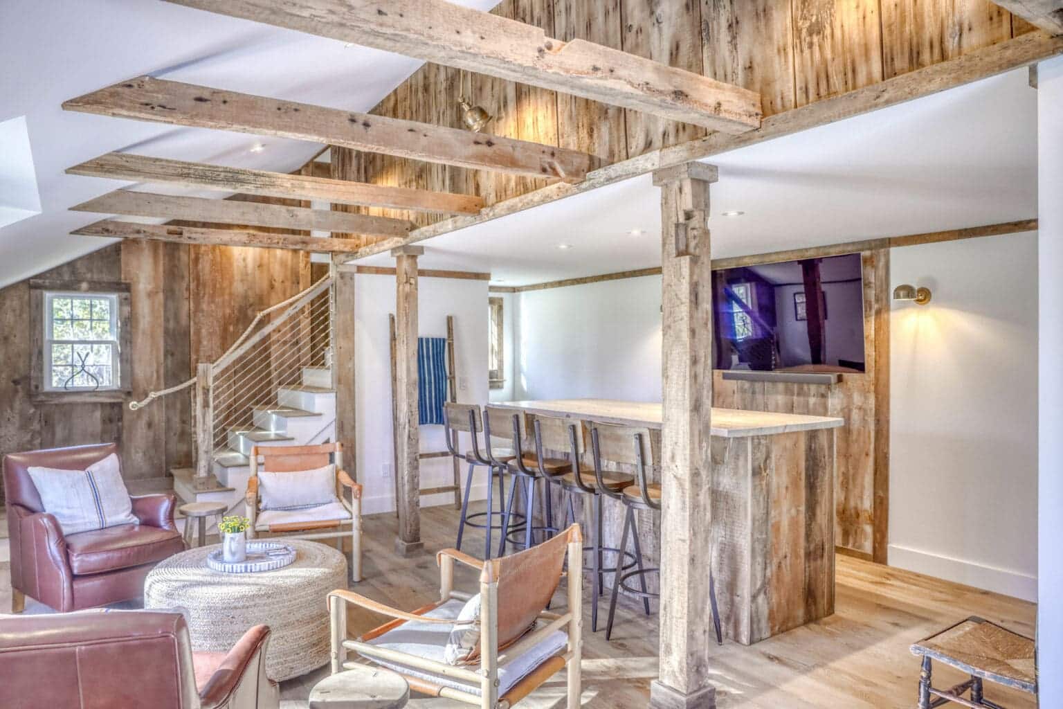 What stands is a charming living space layered with authenticity, brimming with reclaimed details such as wood lining accent walls and ceiling beams. A custom bar, crafted completely out of barn materials, offers a tangible reminder of the barn’s history.
