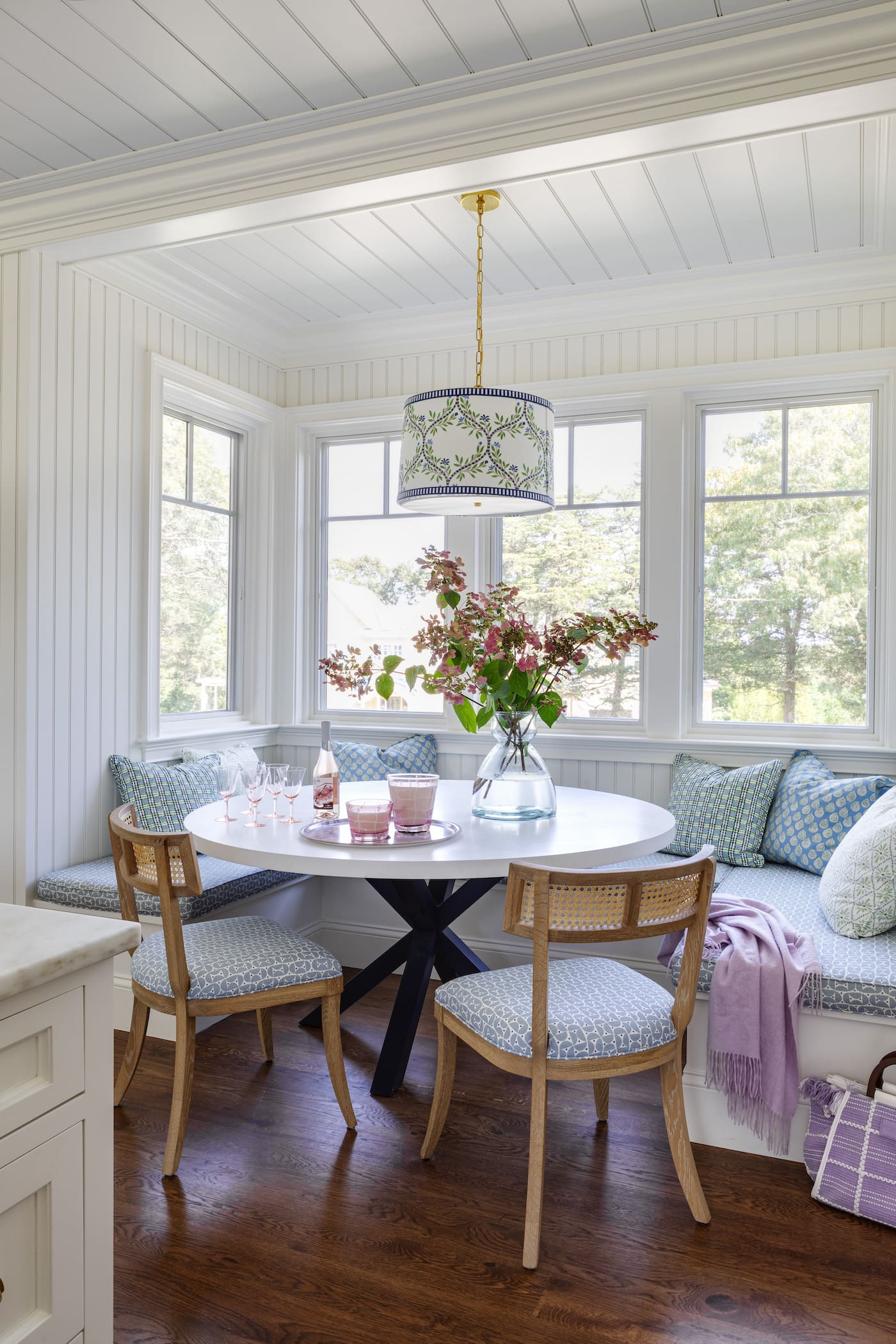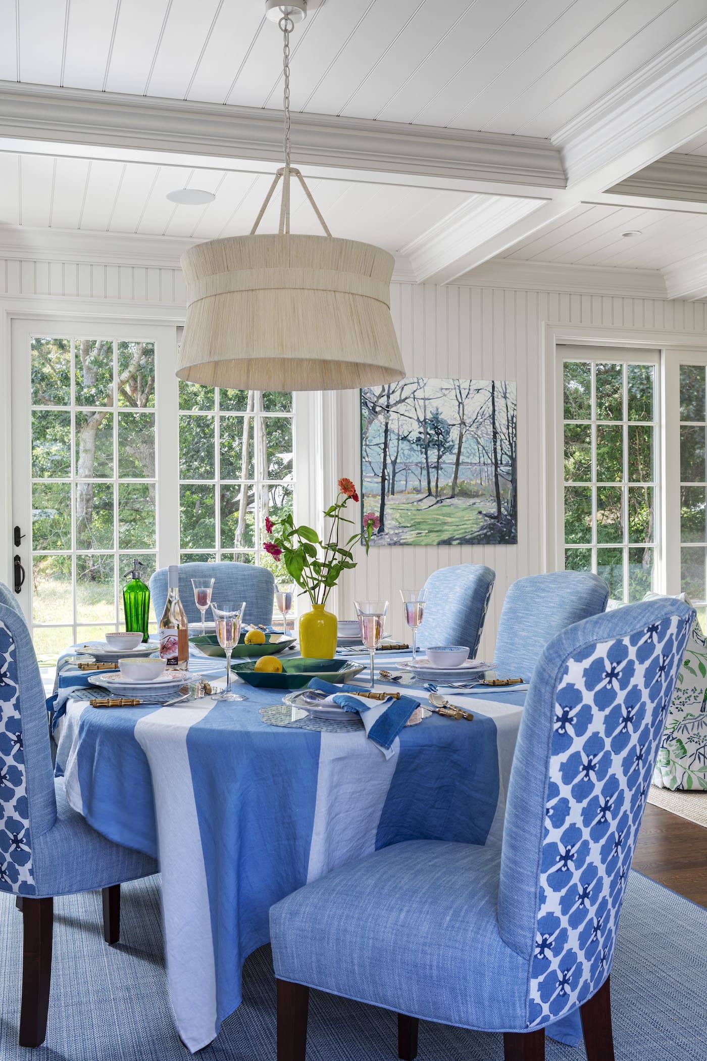 At the heart of the “Digs Mix” is a thoughtful use of a cohesive color palette paired with a serene backdrop. This foundation allows Chiappone to experiment with bold patterns and textures without overwhelming the space. In this Chapoquoit home, the dining room serves as a perfect example: the dining chairs feature a punchy pattern on their backs, while the interiors are upholstered in a calming solid linen, creating balance and harmony. This clever interplay of boldness and restraint is a hallmark of Chiappone’s design philosophy.