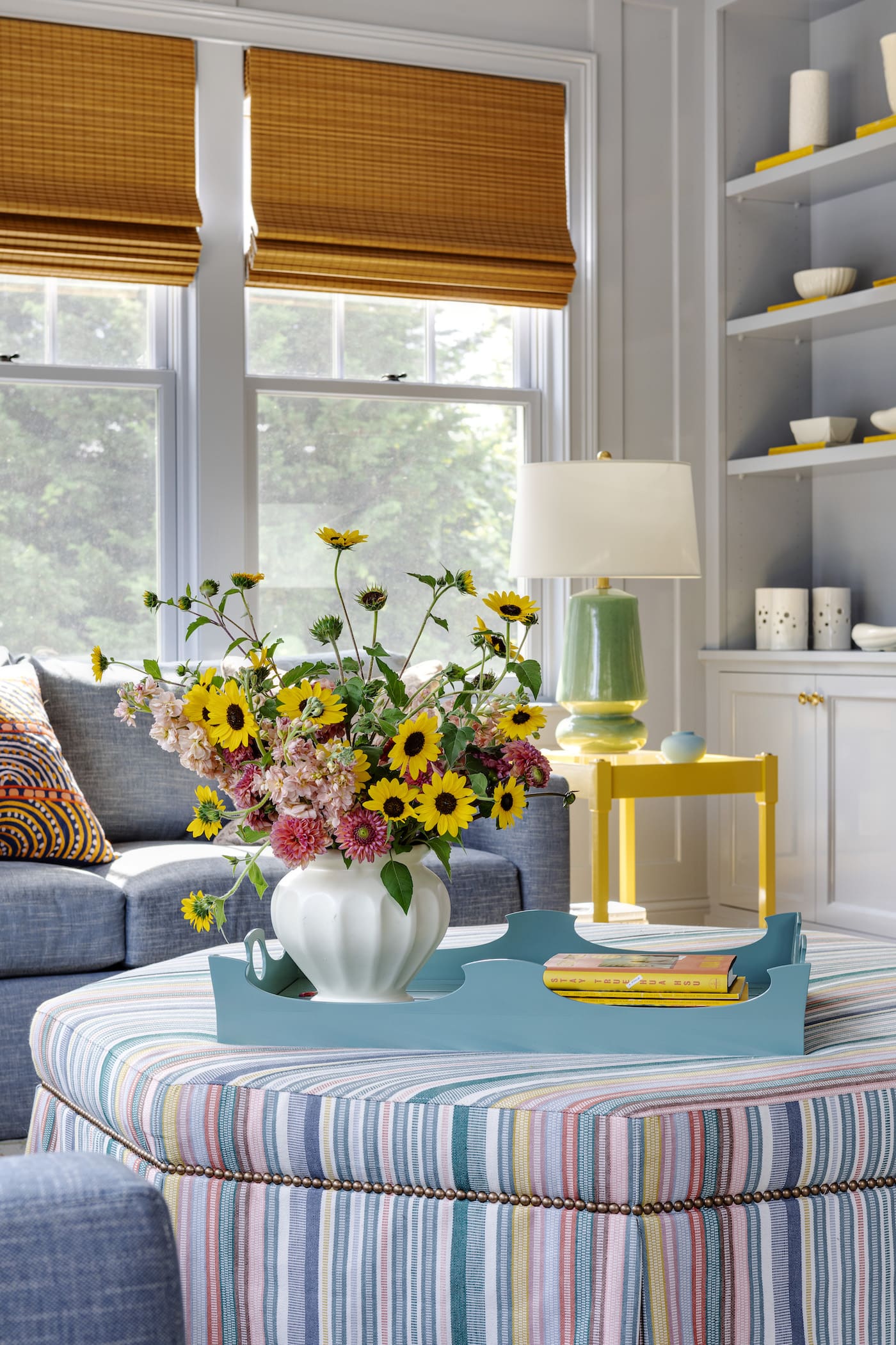 In the living room, Chiappone continues to showcase her mastery of color and pattern. A striped ottoman in a rainbow of hues serves as a playful focal point, instantly drawing the eye and energizing the space. The sunny yellow stripe from the ottoman is echoed throughout the room in thoughtful details, such as pops of yellow in the bookshelves, throw pillows, and end tables. These vibrant touches are grounded by a serene blue backdrop, seen in the upholstered sectional and wall color, which anchors the room and creates a soothing atmosphere.