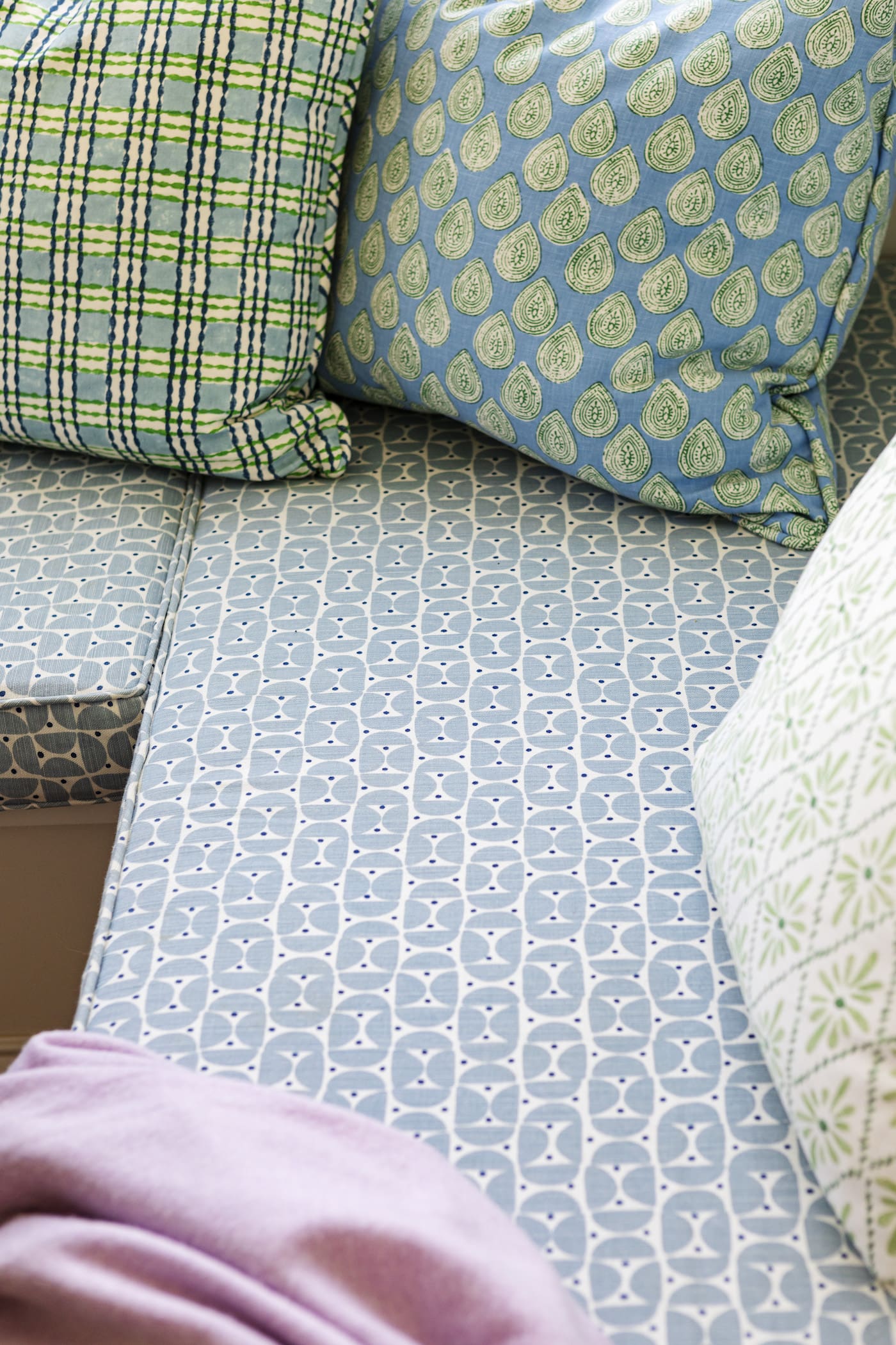 At the heart of the “Digs Mix” is a thoughtful use of a cohesive color palette paired with a serene backdrop. This foundation allows Chiappone to experiment with bold patterns and textures without overwhelming the space. In this Chapoquoit home, the dining room serves as a perfect example: the dining chairs feature a punchy pattern on their backs, while the interiors are upholstered in a calming solid linen, creating balance and harmony. This clever interplay of boldness and restraint is a hallmark of Chiappone’s design philosophy.