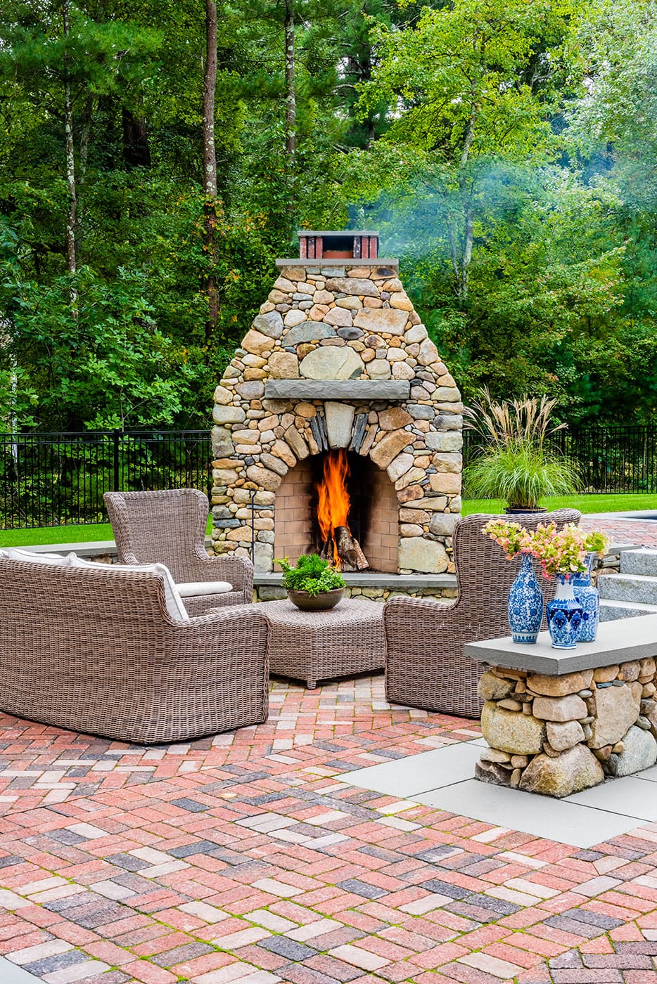 This wood-burning beauty by BrickStone Design + Build is the backbone of what is, in essence, a second living room situated on a brick patio with a bluestone border. The artfully rendered fireplace was custom built for the client and sculpted in New England fieldstone with a bluestone mantel to match the banding of the patio and the caps of the stone walls, which double as additional seating.