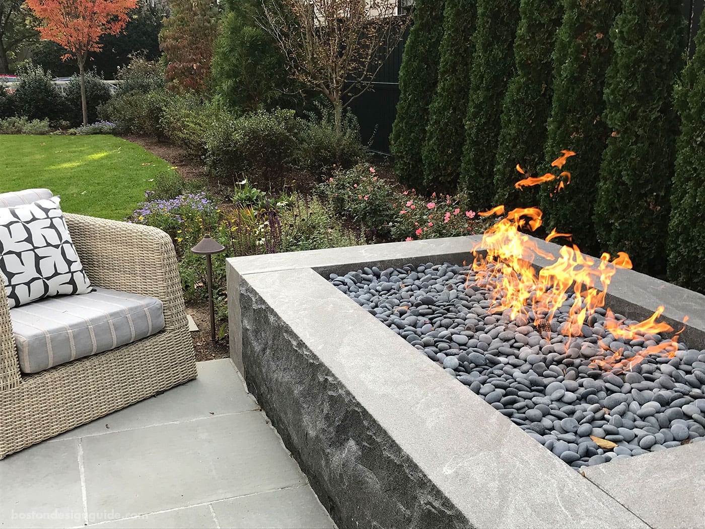 When it comes to fanning the flames, this landscape design in Westwood by a Blade of Grass features the best of both worlds. While a wood-burning fireplace warms the open-air structure, a ring of fire, built out of mosaic New England fieldone capped in thermal bluestone, is open to the elements, inviting conversation on a raised natural cleft bluestone patio space.