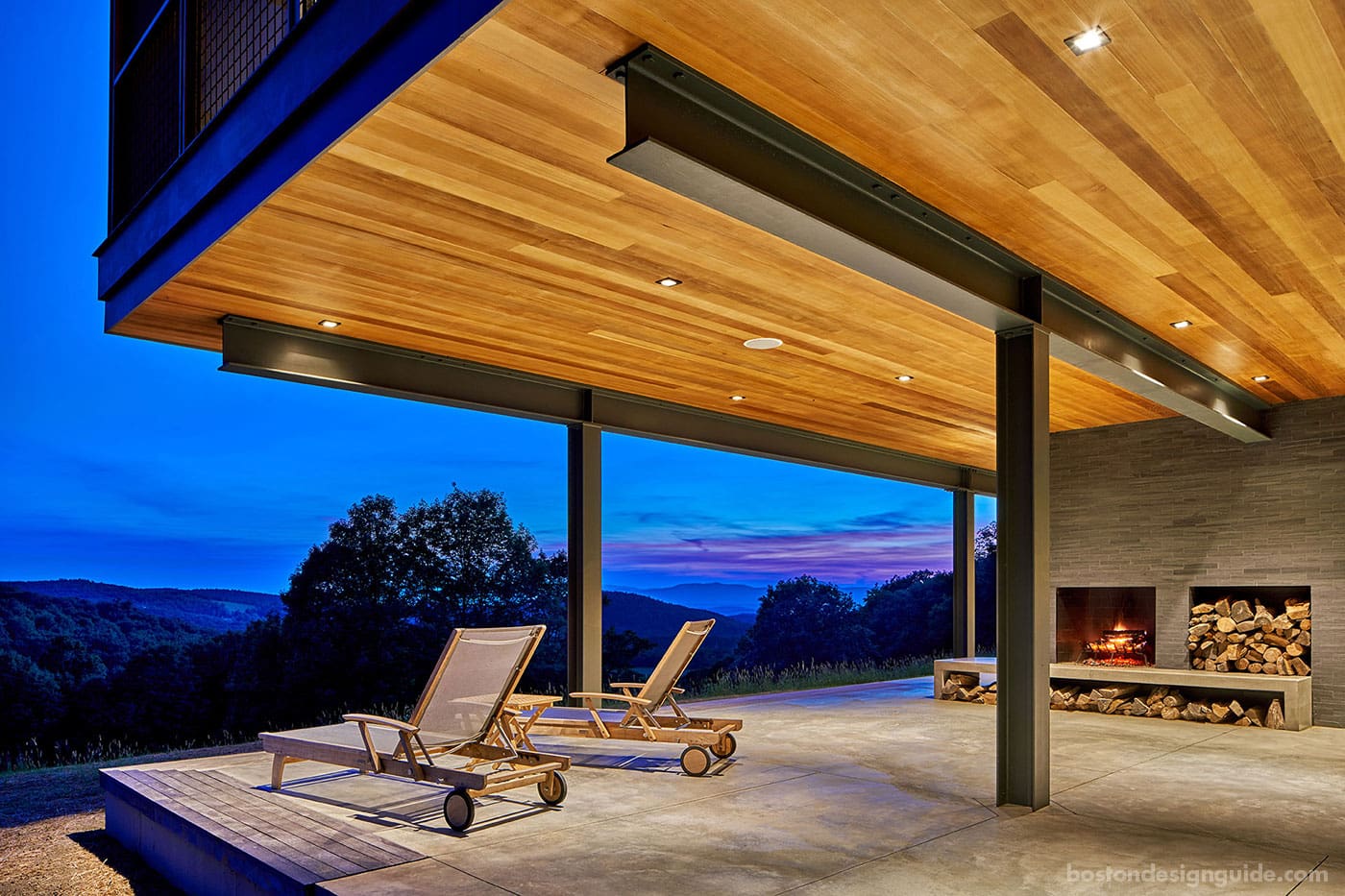 This incredible family retreat in the Catskills, with a landscape conceived by Matthew Cunningham Landscape Design, boasts majestic mountain views and a terrace and hearth of poured and polished concrete. The wood-burning fireplace warms the inhabitants as they sit protected within the cantilevered, contemporary space and take in the ever-changing vistas from the Ipe wood bench or chaise lounges.