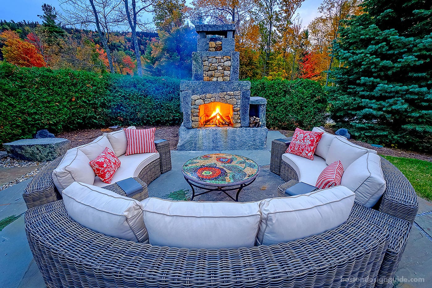 Though part of a larger landscape program in Newbury, New Hampshire, blessed with a pool and pool deck, this commanding fireplace gets a terrace and grade of its own. Here, Pellettieri Associates, Inc. positions the multi-tiered fireplace, with its artistic mix of stone, against a backdrop of trees, allowing residents to feast on the flames as well as autumn’s glory.