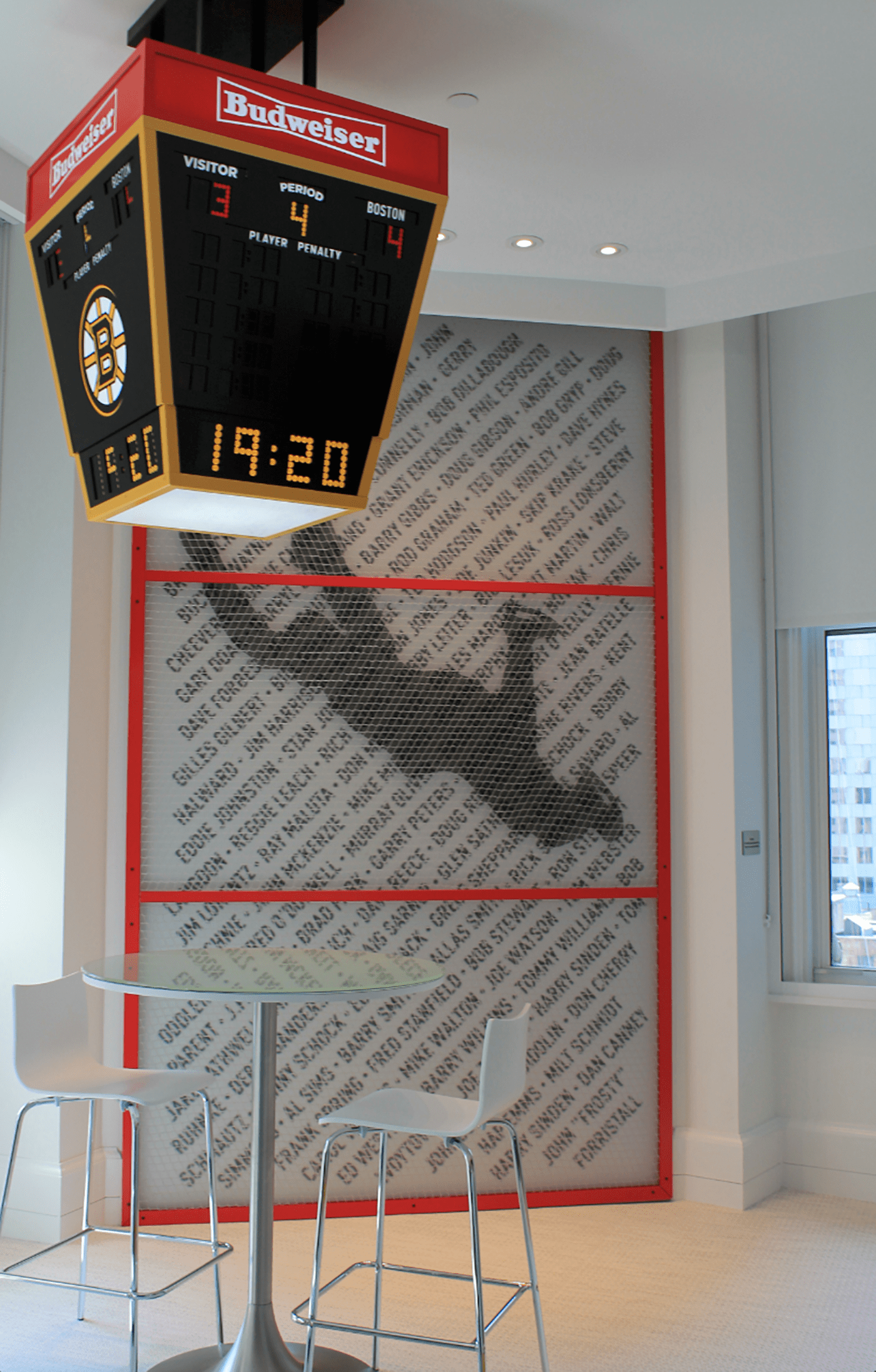 B’s buffs enter through a door emblazoned with a 4 to find inspirational quotes by Orr, a skate hologram in a full-length mirror, trophies and photos of Orr in action. Inside, they step on to a custom white floor resembling a rink (complete with face-off circles and a blue line), as well as a replica of a 1970s penalty box and a locker room built by Sea-Dar, and a scoreboard that doubles as a light fixture.