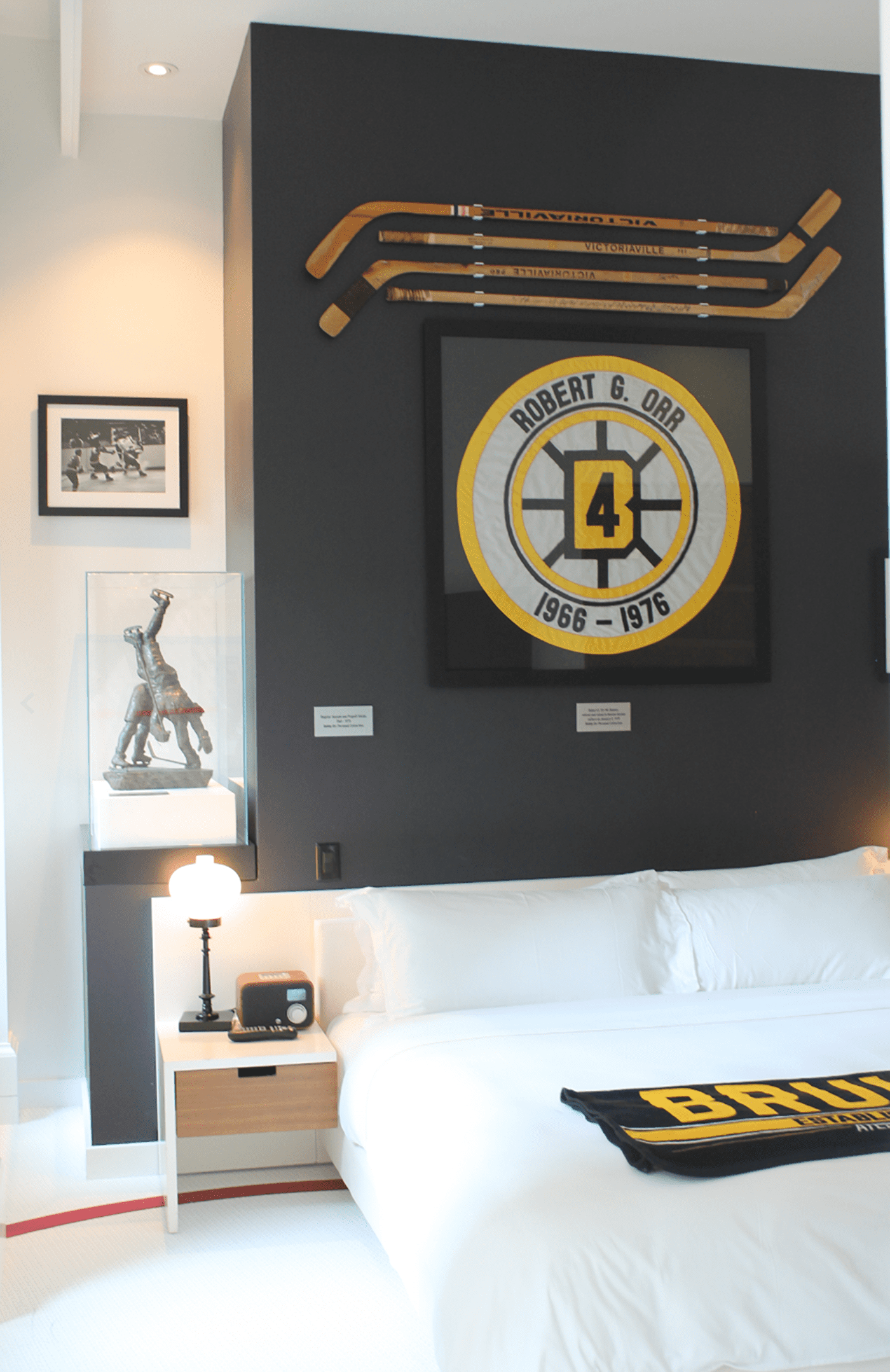 Bruins’ fans can live in this fantasty room by booking the Bobby Orr Suite at the Ames Boston Hotel
