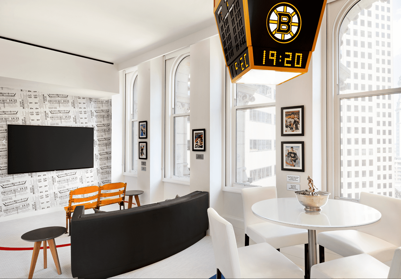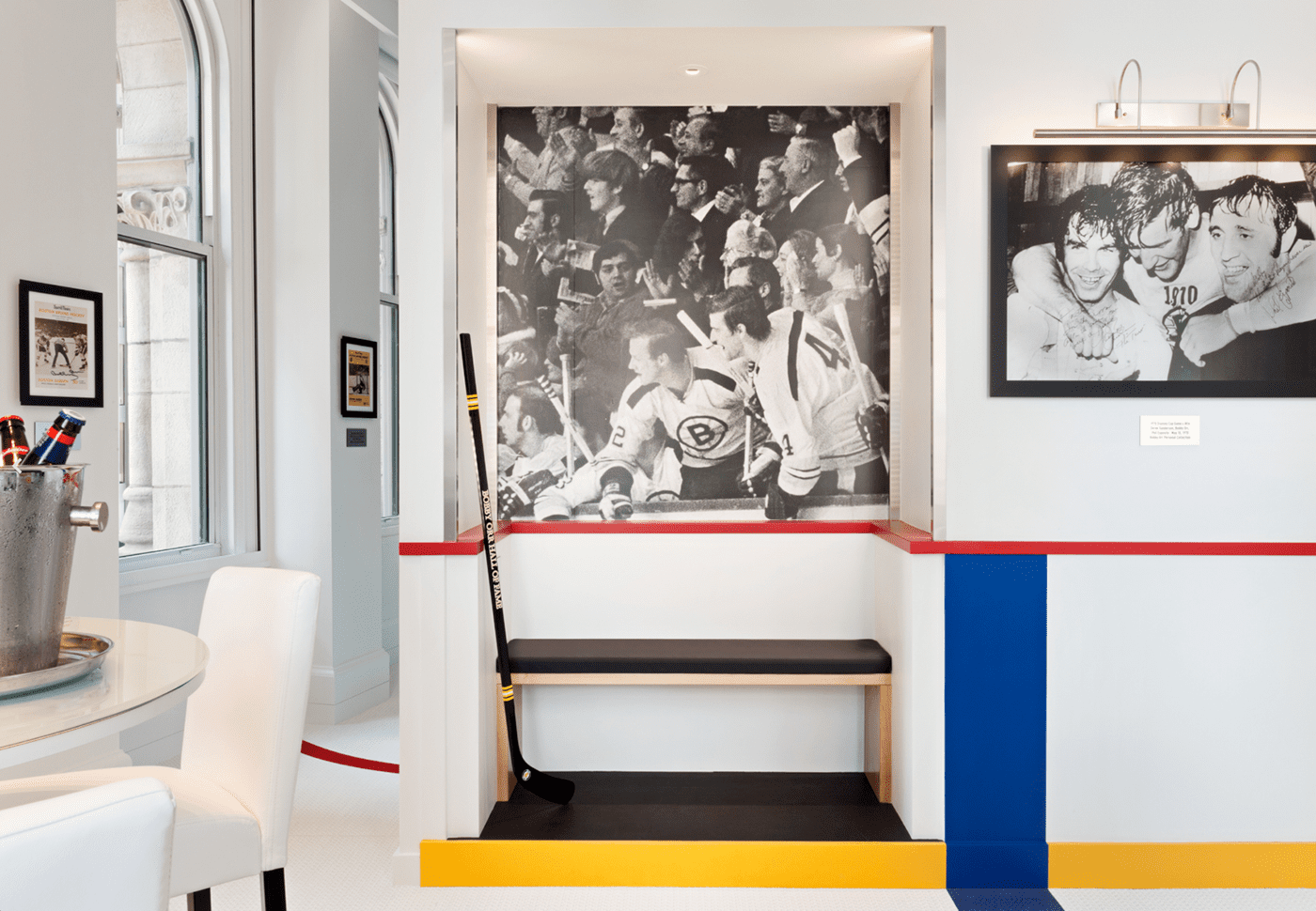 Paging Boston hockey fans. Sea-Dar Construction transformed a hotel suite on the 14th floor of the Ames Boston Hotel into a shrine to Bruins great Bobby Orr. Conceived by architect Bergmeyer Associates, this is the first winter for the custom 570-square-foot space, which allows guests to surround themselves with hockey memorabilia, trophies and images and highlight-reel worthy reproductions.