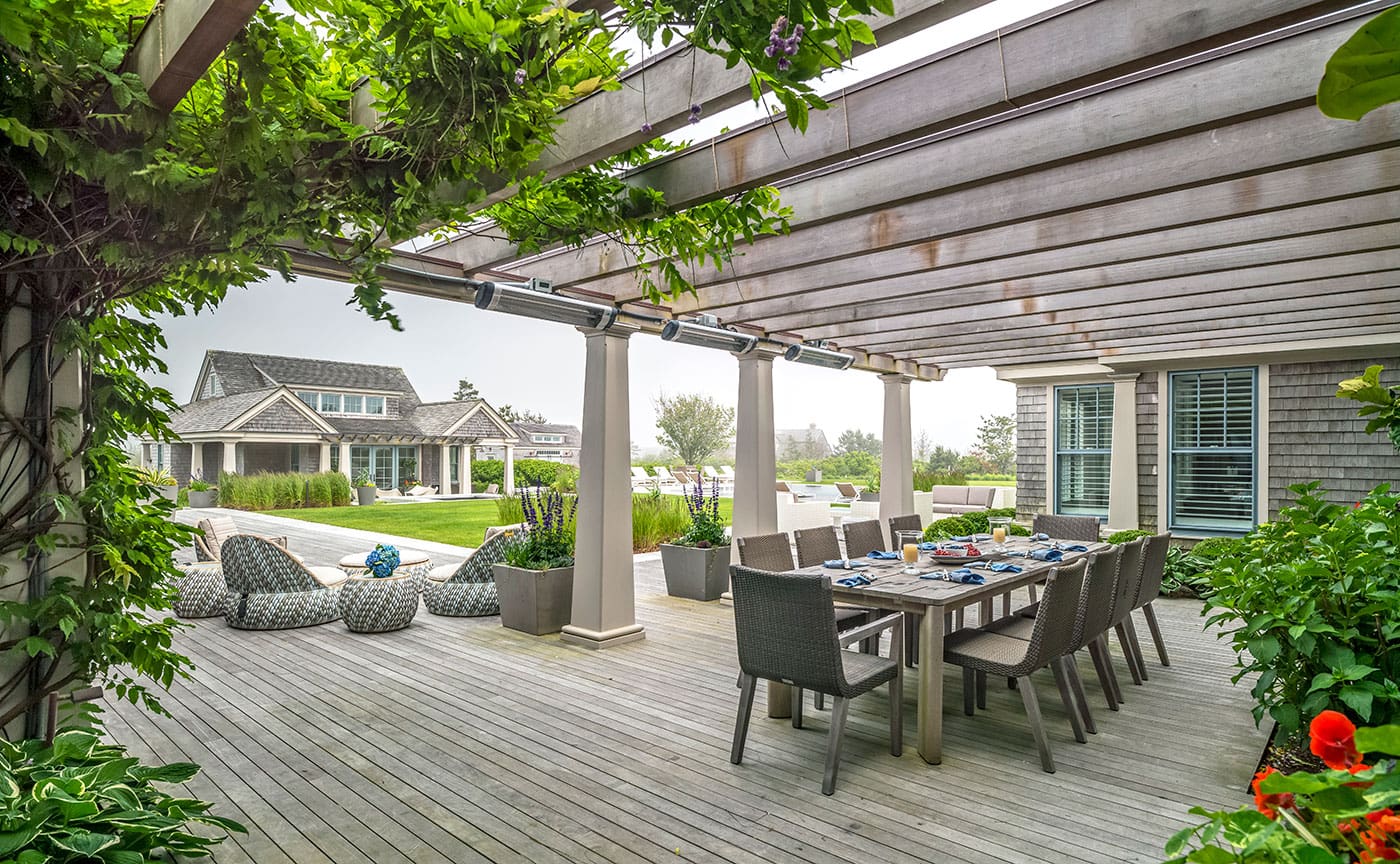Underneath a pergola canopy shaded by climbing vines, this outdoor table is the central gathering place for shared meals. It’s part of a Nantucket landscape conceived by Gregory Lombardi Design which was designed to delight individuals of all ages as well as small and larger groups.