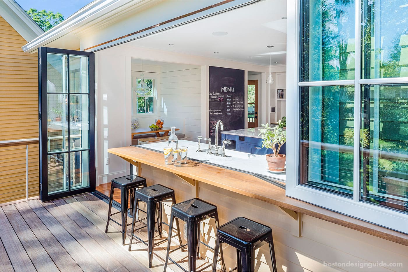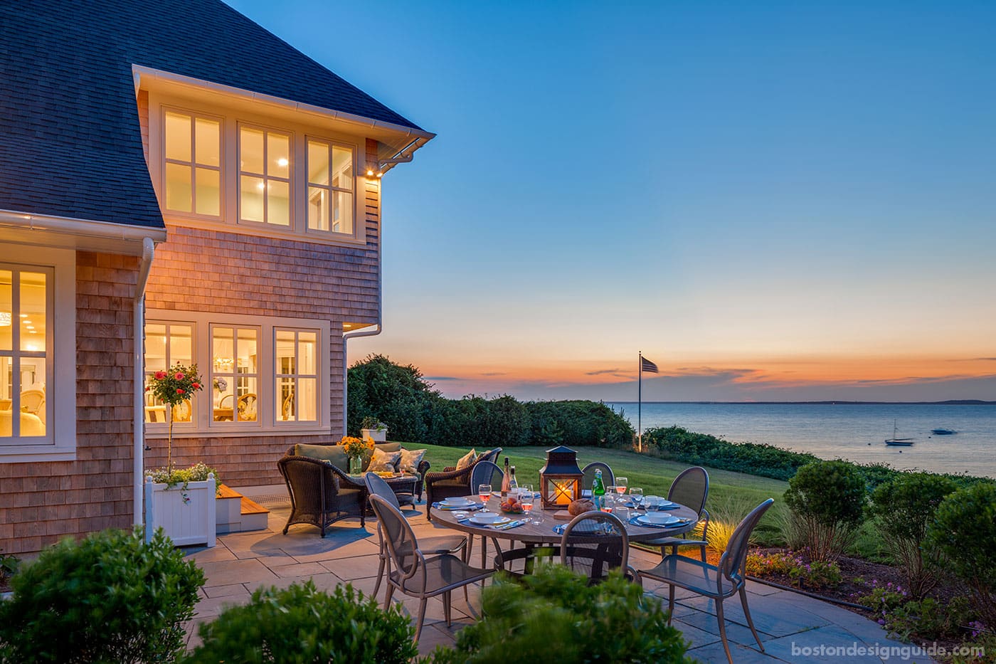 This scene from a harborside home, designed and built by Polhemus Savery DaSilva Architects Builders (PSD), captures the essence of summertime. Come dusk, the side patio is the place to be, as residents drink in water views and glorious sunsets.