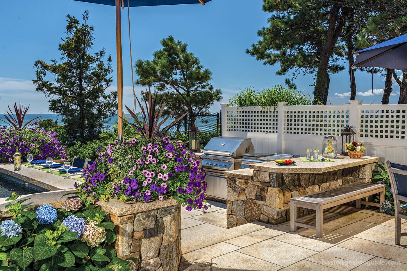 This small terrace, designed and constructed by Sudbury Design Group, overlooking Nantucket Sound is big on pleasure and insight. In addition to a table carved in stone by the grilling station, there is a second bar area overlooking a negative edge pool. Gunite stools submerged in the pool also make use of the counter.