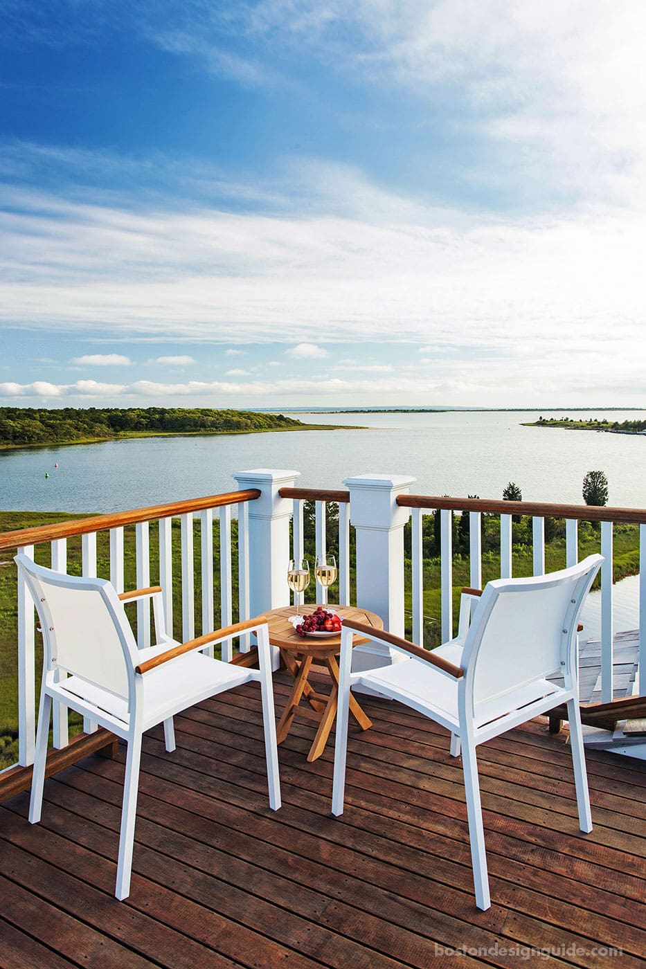 A private deck, designed and built by Thomas J. O’Neill, Inc., is proof that a peaceful setting for two and a crisp glass of wine can be preferable to crowd gathering. This intimate perch is all about immediate company and the seaside vista outstretched in the distance.
