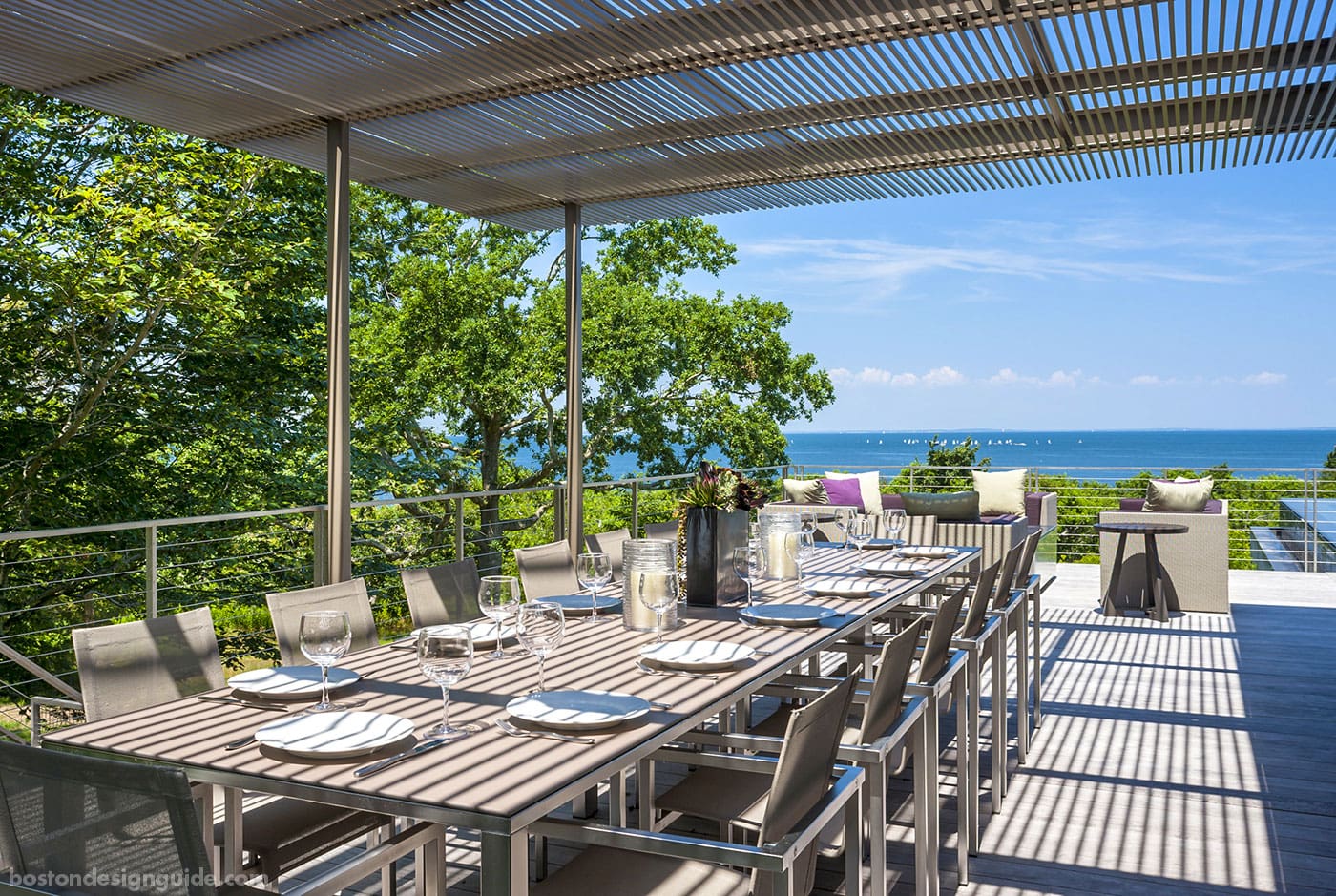 This outdoor dining area by Kistler & Knapp Builders is part of a larger pool house and pavilion on Cape Cod with enviable, panoramic views. Here, residents and guests can sit down to a meal under the pergola and then retire to lounge seating around the fire feature.