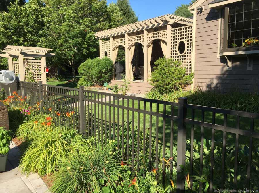 To add romance to the pool garden and grounds of a Colonial style home, Colonial Fence Co. was enlisted to handcraft a custom pergola to serve as an alfresco extension of the residence. The alluring, open-air space allows the homeowners to maximize their enjoyment of the lush landscape and shade themselves from the sun.