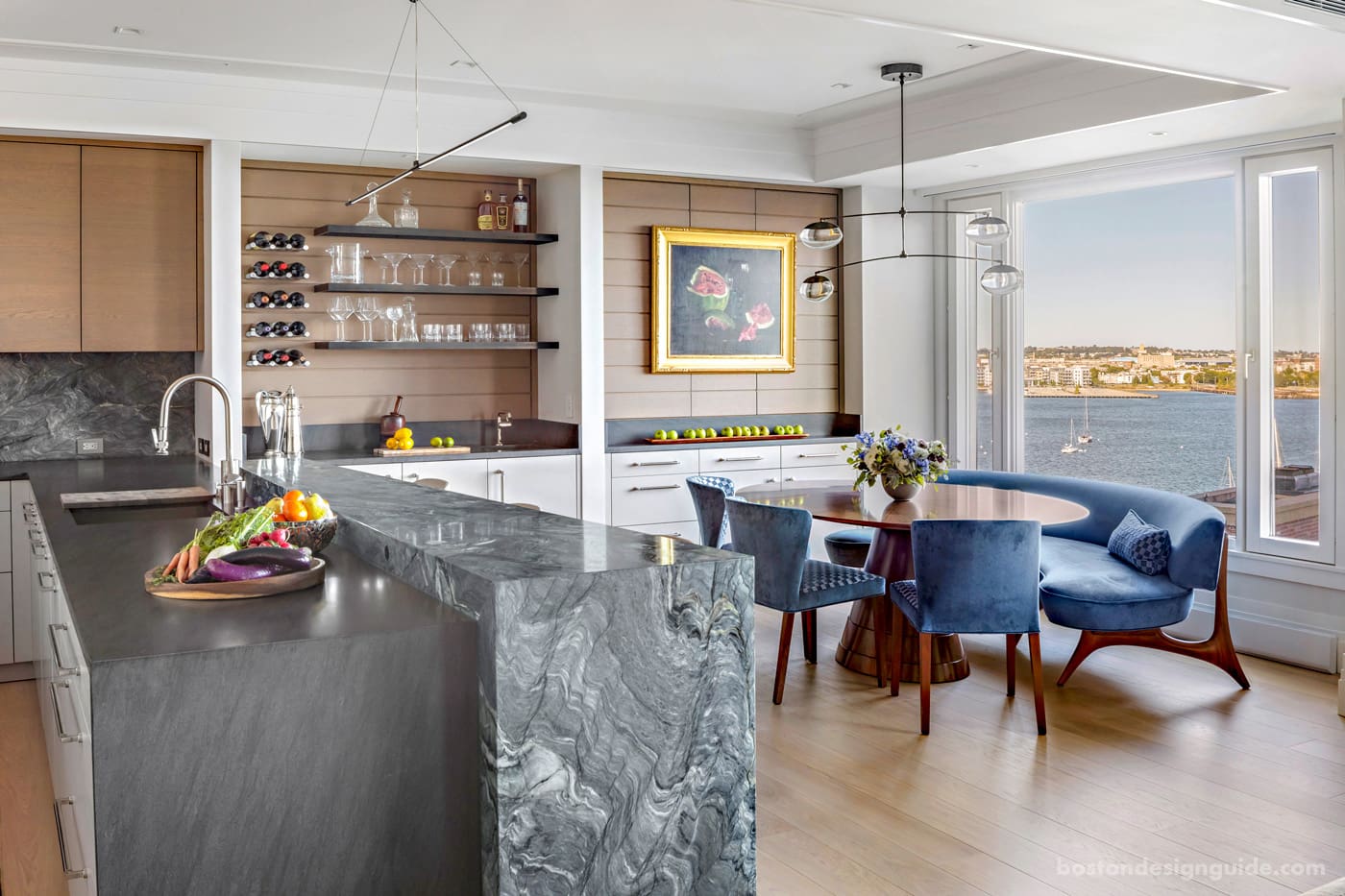 Especially when a project is a bit of a puzzle. Such is the case for this particular home, a gut renovation in which the architects sought to reposition the placement of the kitchen to the back, inner corner of the living space in order to expand the home’s sparkling harborside views. “It’s not that big a space,” says David Foley, who served as the lead architect on the project, “but that single move could mean everything.”