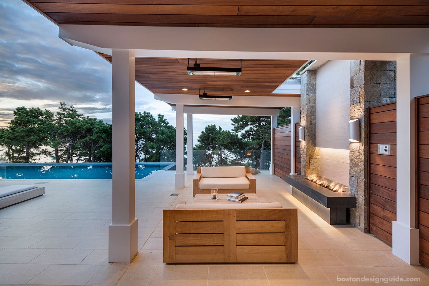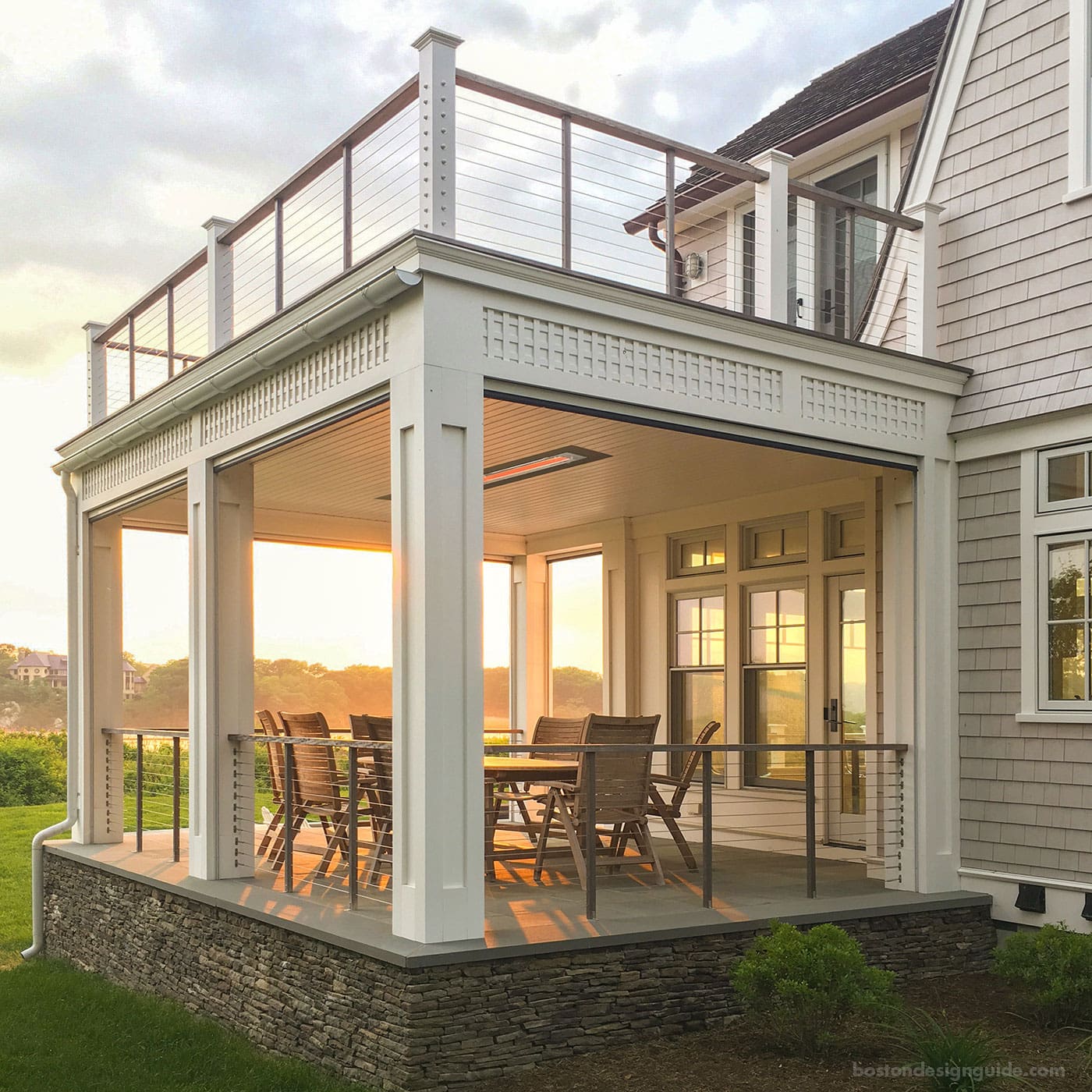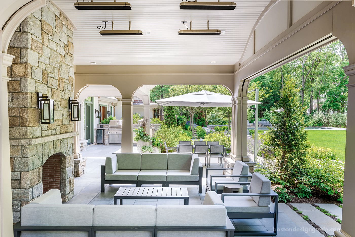 This classic outdoor porch built by WKP Construction in Newport invites residents to linger longer thanks to the integrated infrared heater. Here, the custom builder installed an Infratech heater from Sunglow Industries flush within the ceiling.
