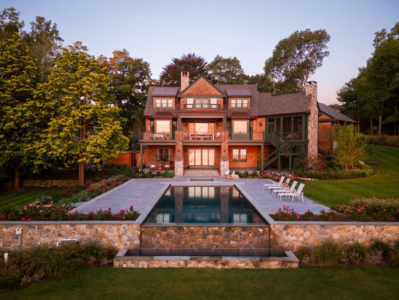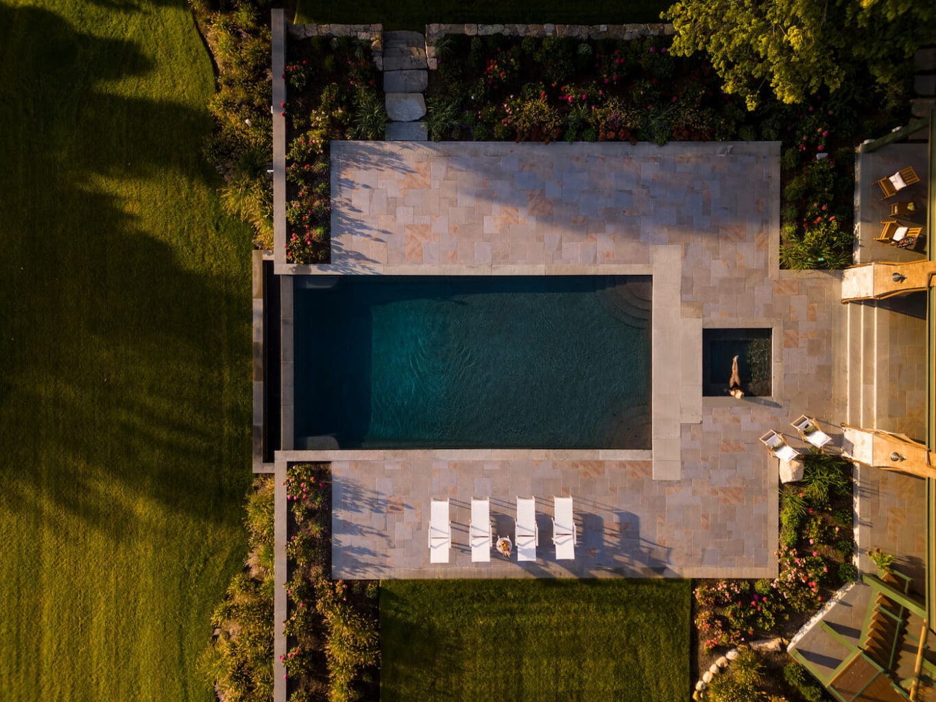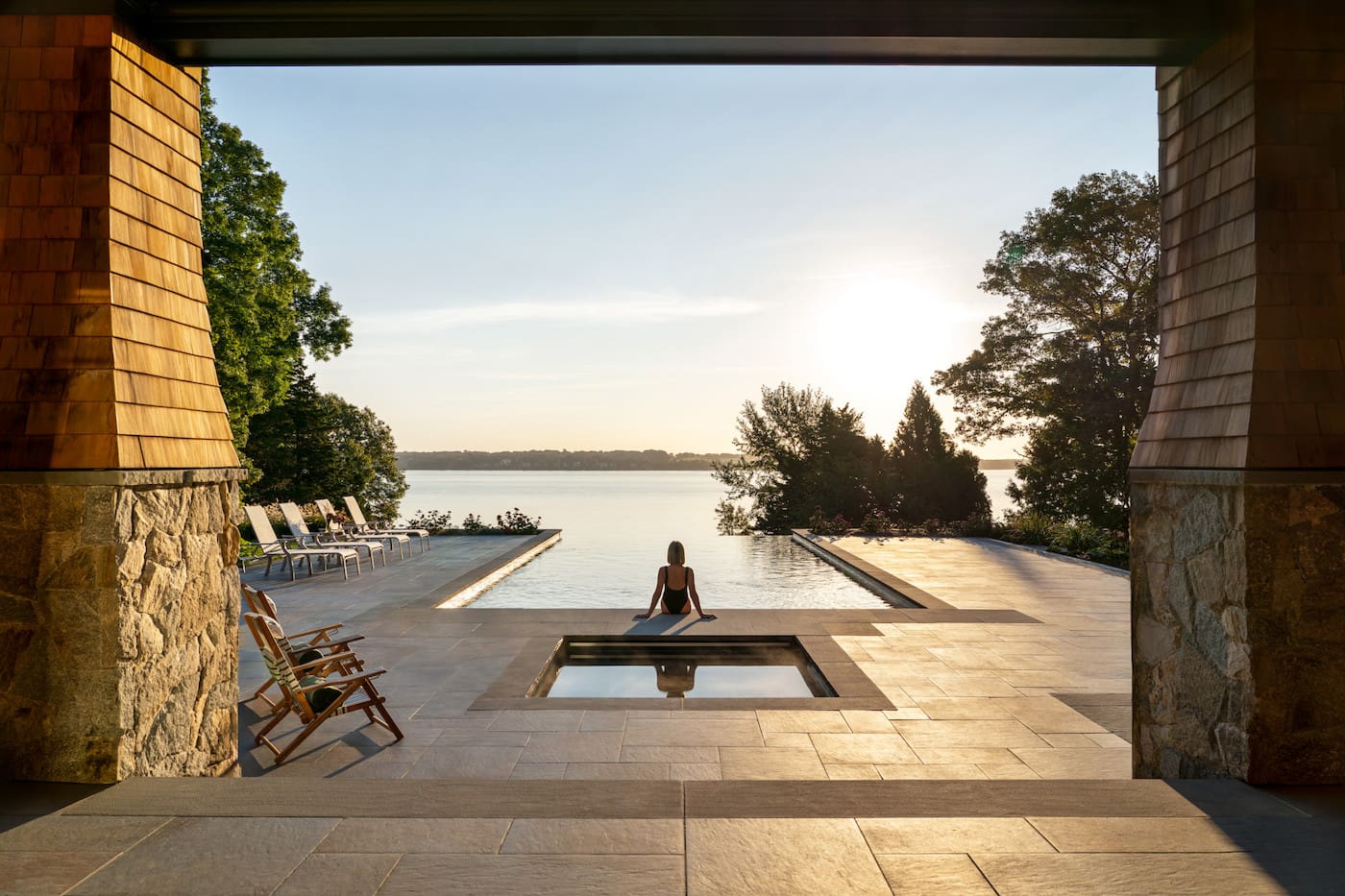 The landscape design, led by Landscape Architect Lisa Frazier of Mather & Page, was driven by both the qualities of the site and the homeowner’s desire for a dynamic outdoor experience. A spacious pool terrace became the heart of the landscape program, with its design carefully calibrated to the home’s scale and topography. “Rather than aligning parallel to the house, the pool extends perpendicularly into the landscape,” Votalato describes. The visual effect is a vanishing edge that appears to merge with the bay’s horizon.