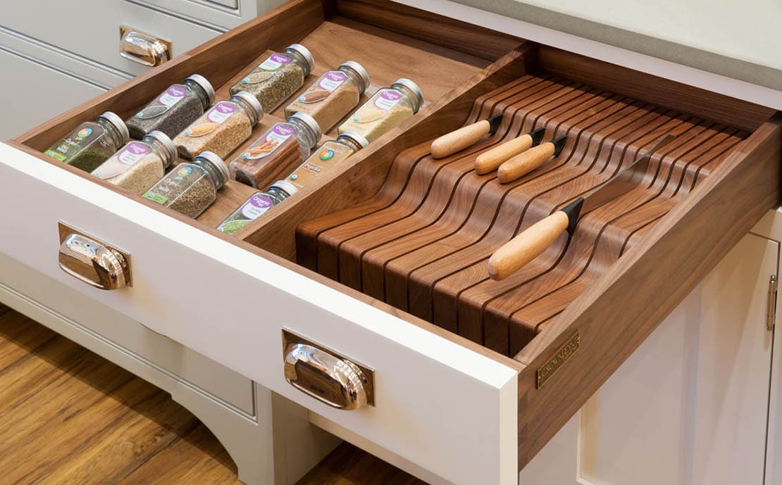 The rich walnut cabinet interiors are always a beautiful surprise. “Walnut organizational components are an interior treat,” says Brian Stowell of Crown Point. “Your storage needs are met, and walnut promises long-term durability. When you open up the doors on a cabinet and you look at that walnut, never having seen it before, you are taken aback by its beauty.”
