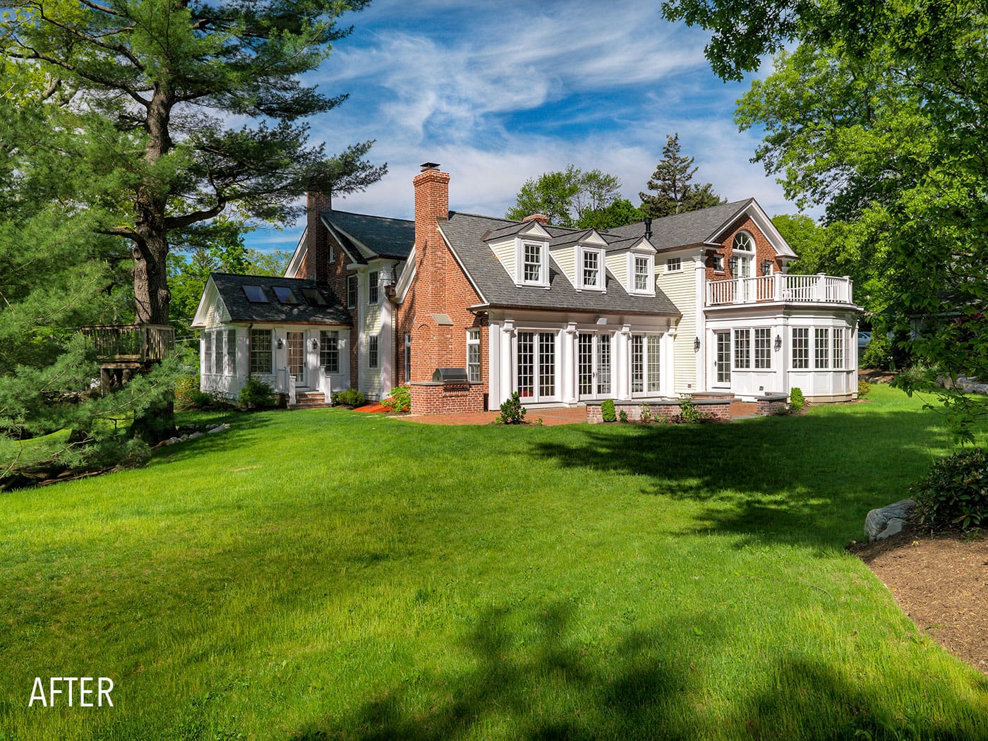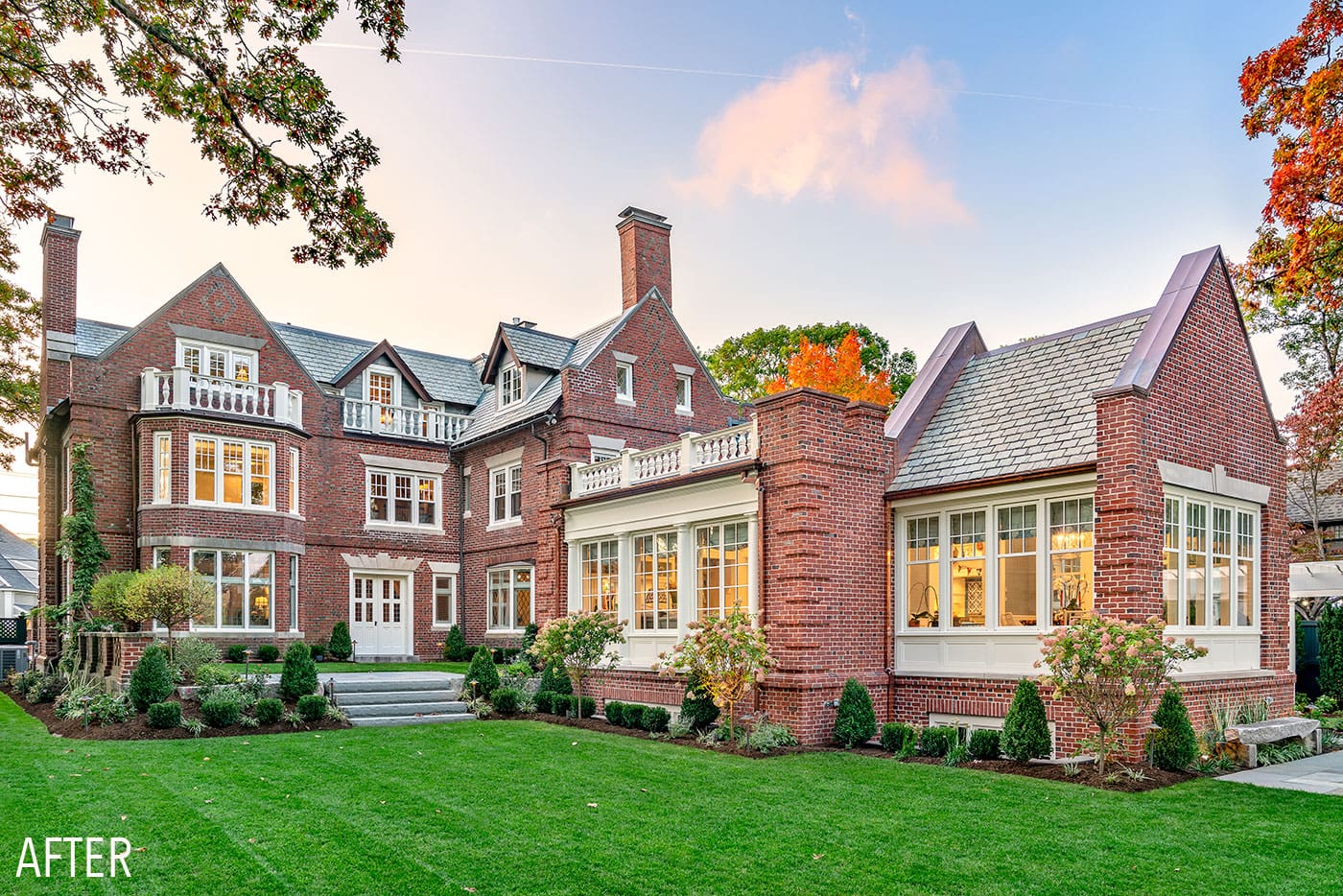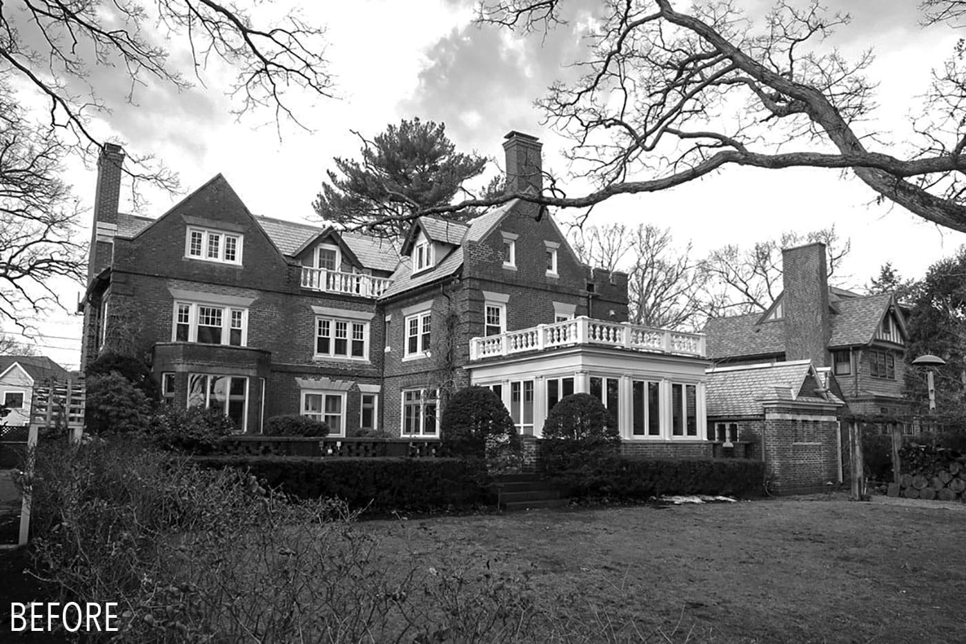 Rather than carving up the fabric of the historic home, the duo designed an addition encompassing a new kitchen, family room, breakfast room, mudroom, and basement rec room. The new wing has sweeping water views and is stitched in seamlessly to the main home and enveloped in the same intricate brickwork and masonry detail of the original structure.