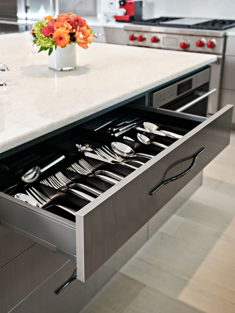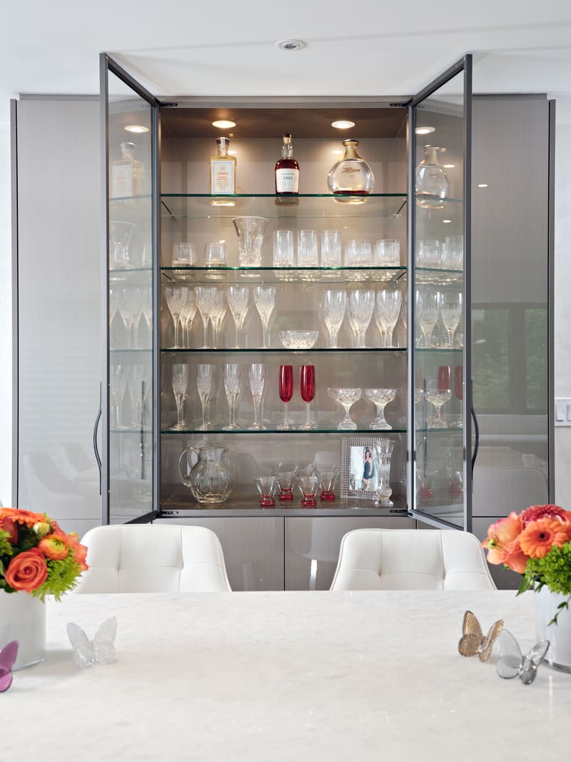 Functional storage also gives them the creative opportunity to highlight their favorite items. “I wanted to showcase all of my crystal and stemware so we designed a glass hutch with metal doors and beautiful lighting inside,” explains Tricia.