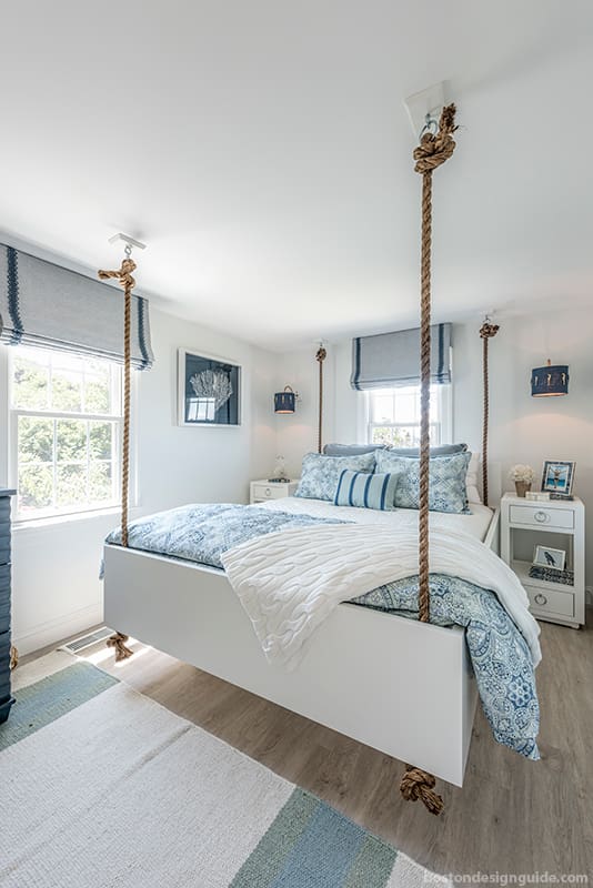 Rope also provided an extra bit of whimsy for another smaller-scale space, a guest bedroom designed by Casabella Interiors for a 1,008-square-foot, three-bedroom home that is literally on the beach, says owner Michele Chagnon-Holbrook. In a home this small, “every inch matters,” says the designer; and, given that “you walk out from the deck to find your feet in the sand,” so does every bedroom, she adds.