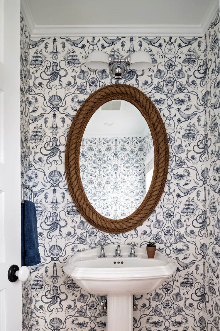 In a tiny powder bath conceived by Washashore Home, pictured above, a mirror framed with rope provides a spirited finish to fanciful blue and white wallpaper swimming with mermaids, octopi, whales and lighthouses. More cinnamon than driftwood in hue, “the rope mirror brings in a different layer of texture while still playing off the nautical theme,” contends Owner and Designer Peyton Lambton, who heads up the design studio with fellow Owner/Designer Sarah Waldo. “We felt the paper and mirror were made for each other!”