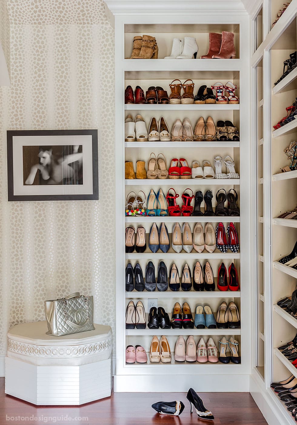 The closet was designed with the client’s impressive shoe collection and wardrobe in mind. The custom cabinetry is lined with interior lights and painted a metallic taupe glaze, and the sheen of the leopard print wallpaper with vertical stripes adds glamour. To create the client’s dream closet, Bassett had to find the perfect balance of sparkle and sophistication. She explains, “my design strategy is to layer beautiful fabrics and high-end materials but also to know when to stop. I want to create luxury and calm; a bedroom suite should be a place of peace.”