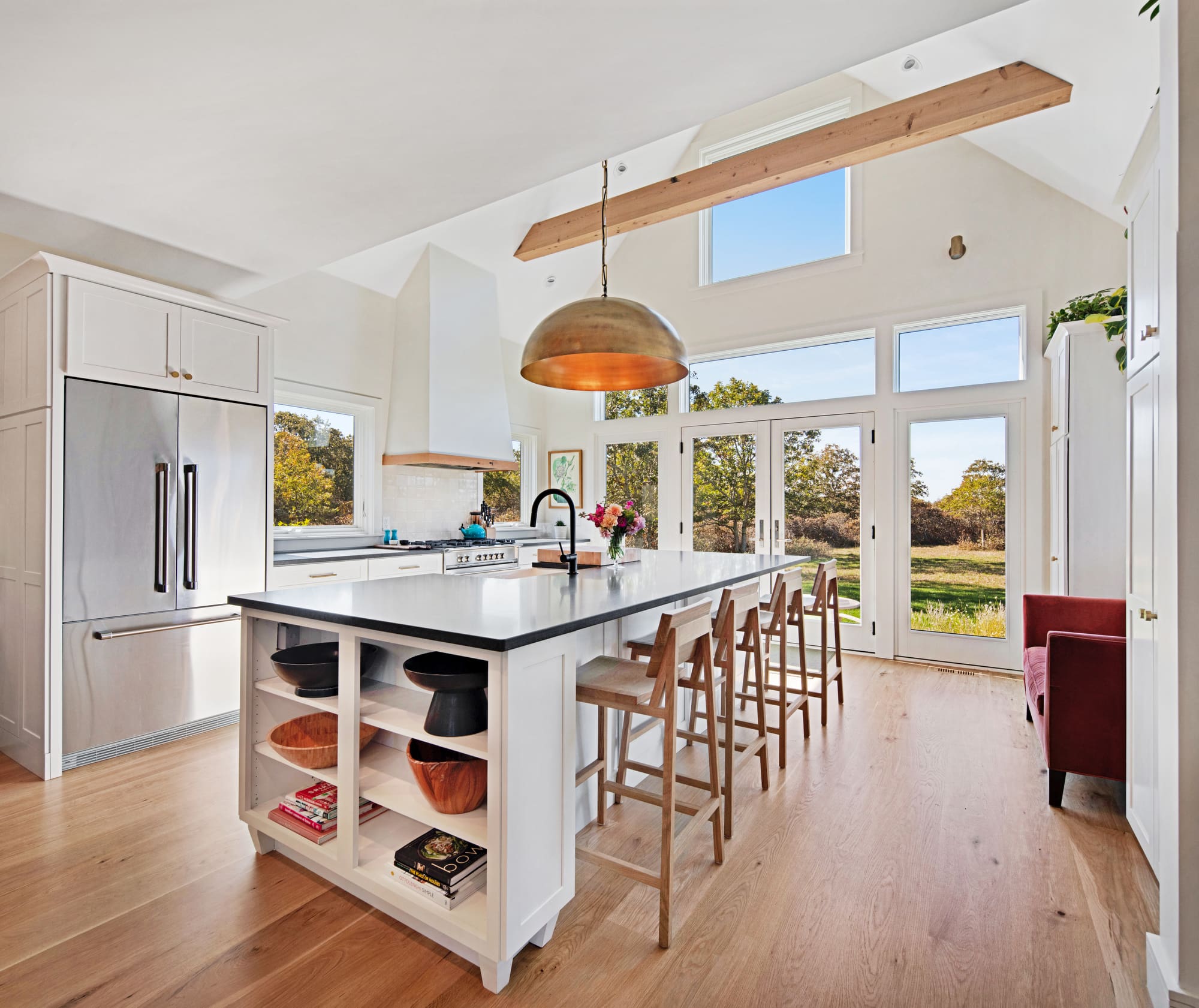 The home was carefully positioned to face SSW to make the most of the golden afternoon light. “Natural light was probably the most important thing for me,” Valle says. “We spent a lot of time walking around the lot at different times of the day to choose the ideal placement.” Large banks of glass let sunlight stream in and bring expansive views of the landscape inside. The kitchen was built as the star of the show, and it’s truly spectacular, with an easy flow, plenty of seating and arguably the best views in the house.