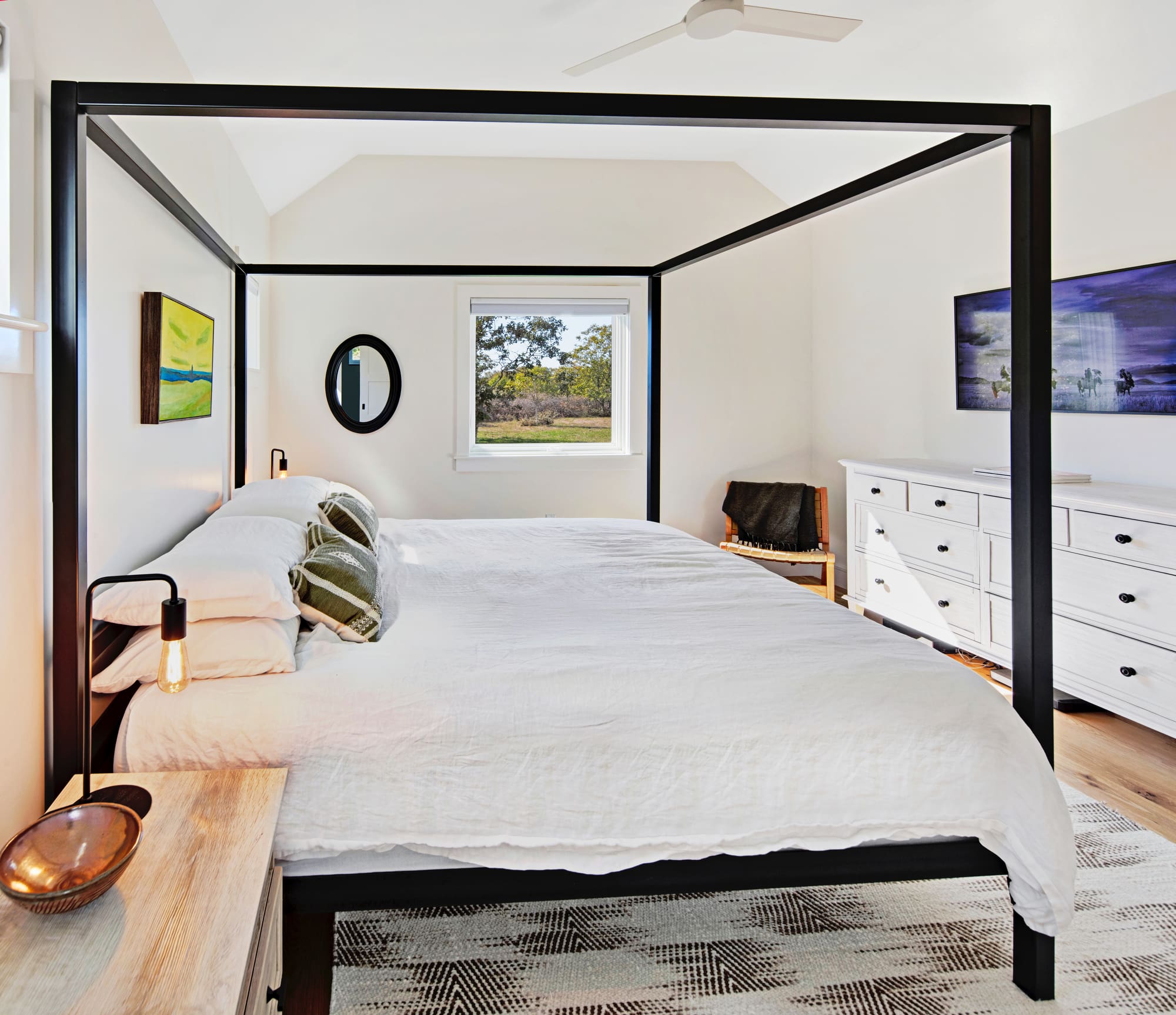 It’s these details that make this home a place for peaceful reflection. The open layout manages to provide private sanctuary spaces and gathering spots for small groups. The wood-burning fireplace is a favorite spot during the winter and, in summer, it’s the fire pit in the backyard, set against the sounds of bullfrogs and breezes through the field of wildflowers.