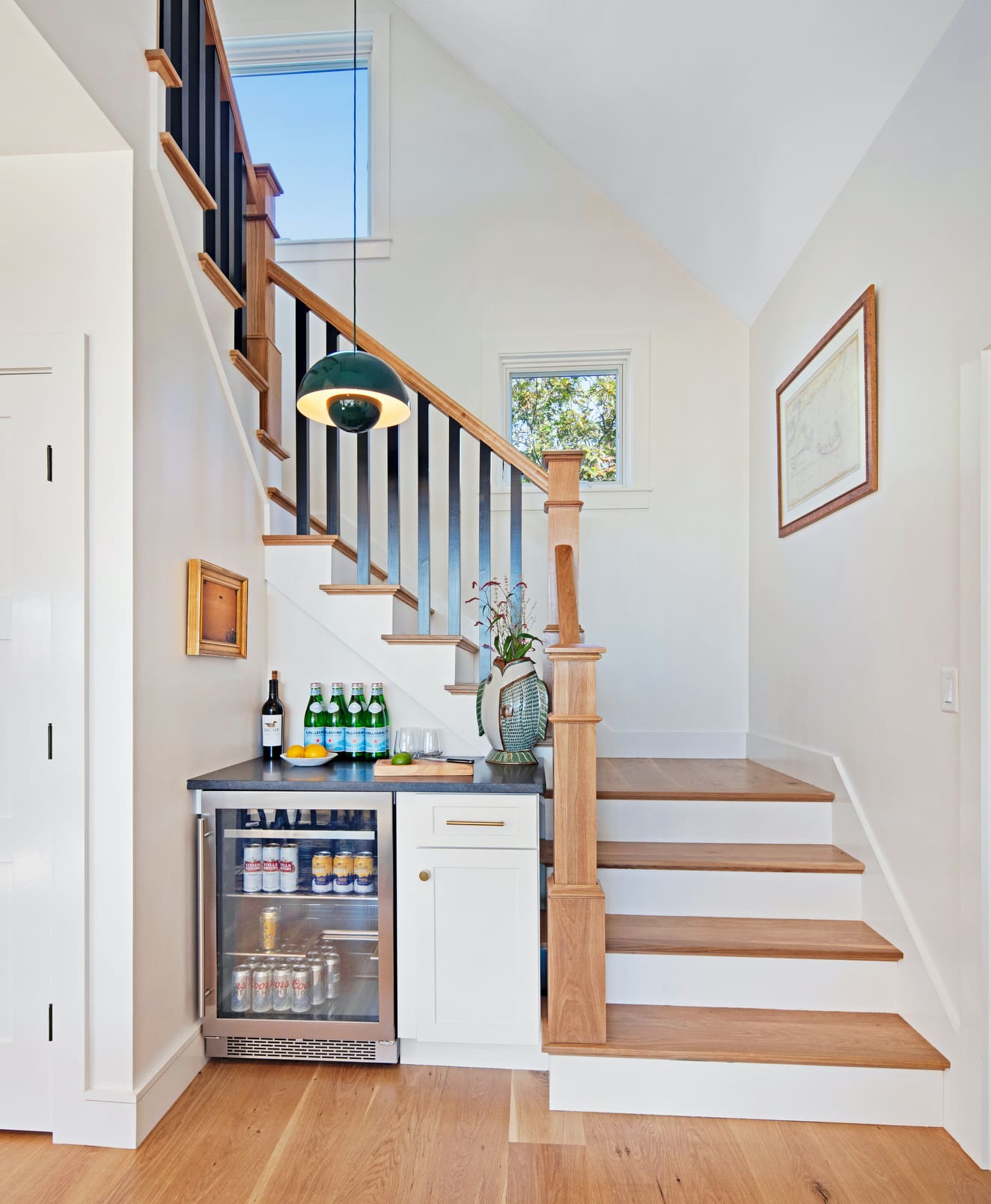 The couple worked with Molly’s brother, Christian Valle, and her parents, Joe and Joan Valle, all three of whom run the Valle Group, a well known custom home builder on Cape Cod, to create a sleek, understated, familyfriendly home. The structure is reminiscent of a row of four interconnected cottages, with classic gables, woven corner cedar siding and white oak flooring throughout. Every inch of the house is purposeful, unfussy, warm and inviting.