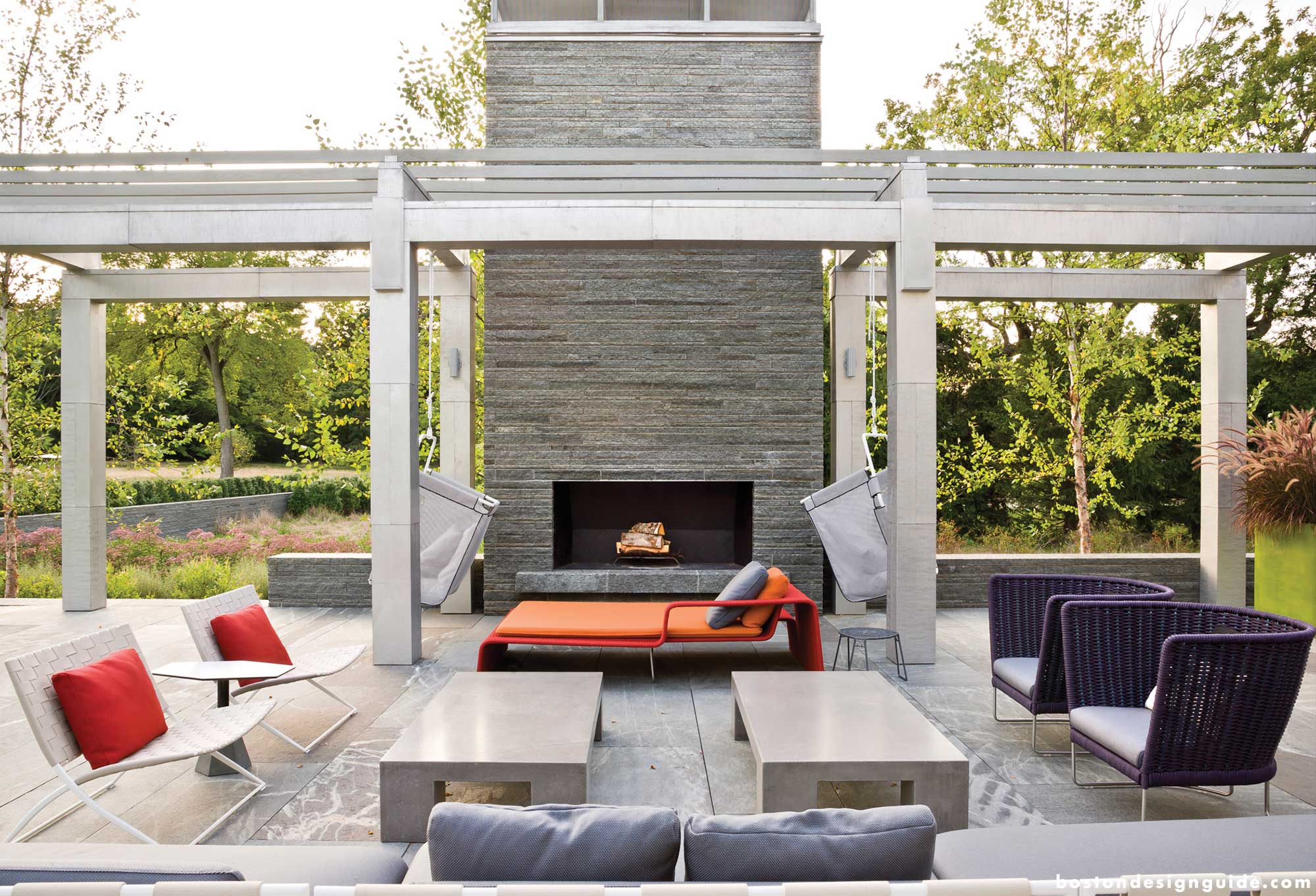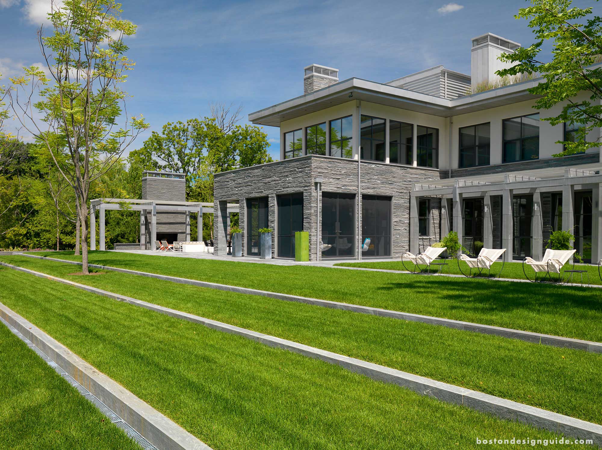 Bob Marzilli, principal of landscape contractor R.P. Marzilli & Company, praises landscape architect Stephen Stimson’s design of a “plank-style pattern that adds to the contemporary lines of the project as whole.” The grounds’ bold geometry pits a lush yard against stone—flat work and granite from Maine, and the landscape walls and outdoor fireplace from the Adirondacks. While initially Vals quartzite was specified for the latter, Marzilli sourced a more cost-effective solution that would still bring the conformity the project warranted. He was able to match the tones found in the home’s veneer with stone quarried in the Adirondacks, and have his team split it and fabricate it for the cohesive, grounded effect of the estate.