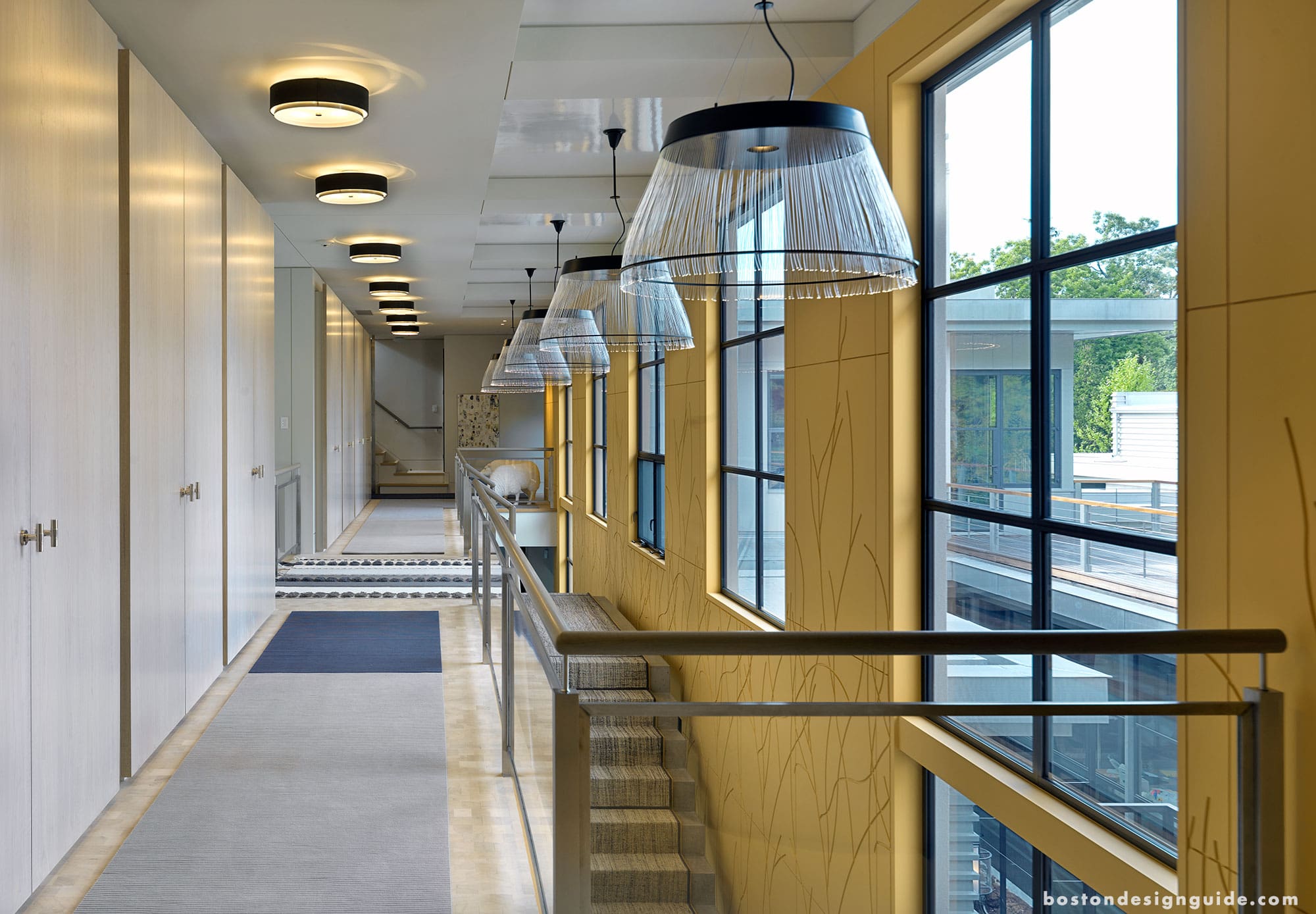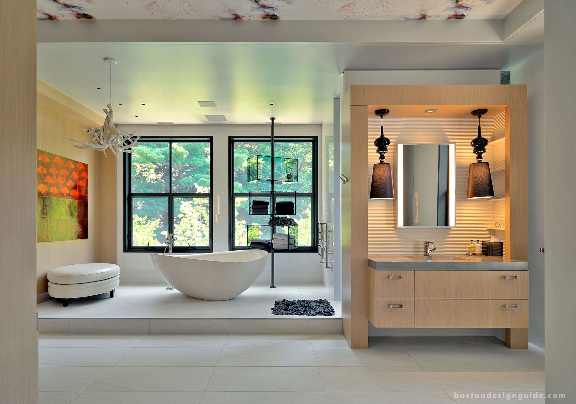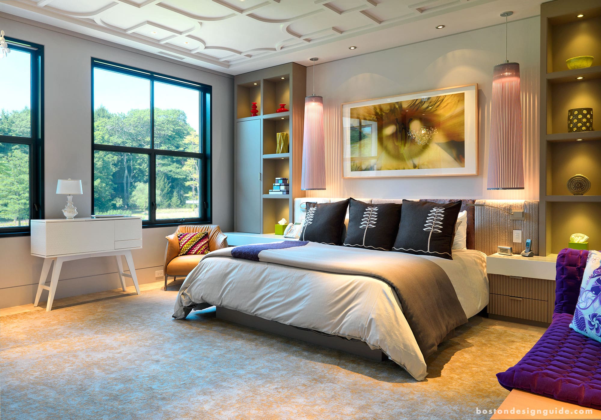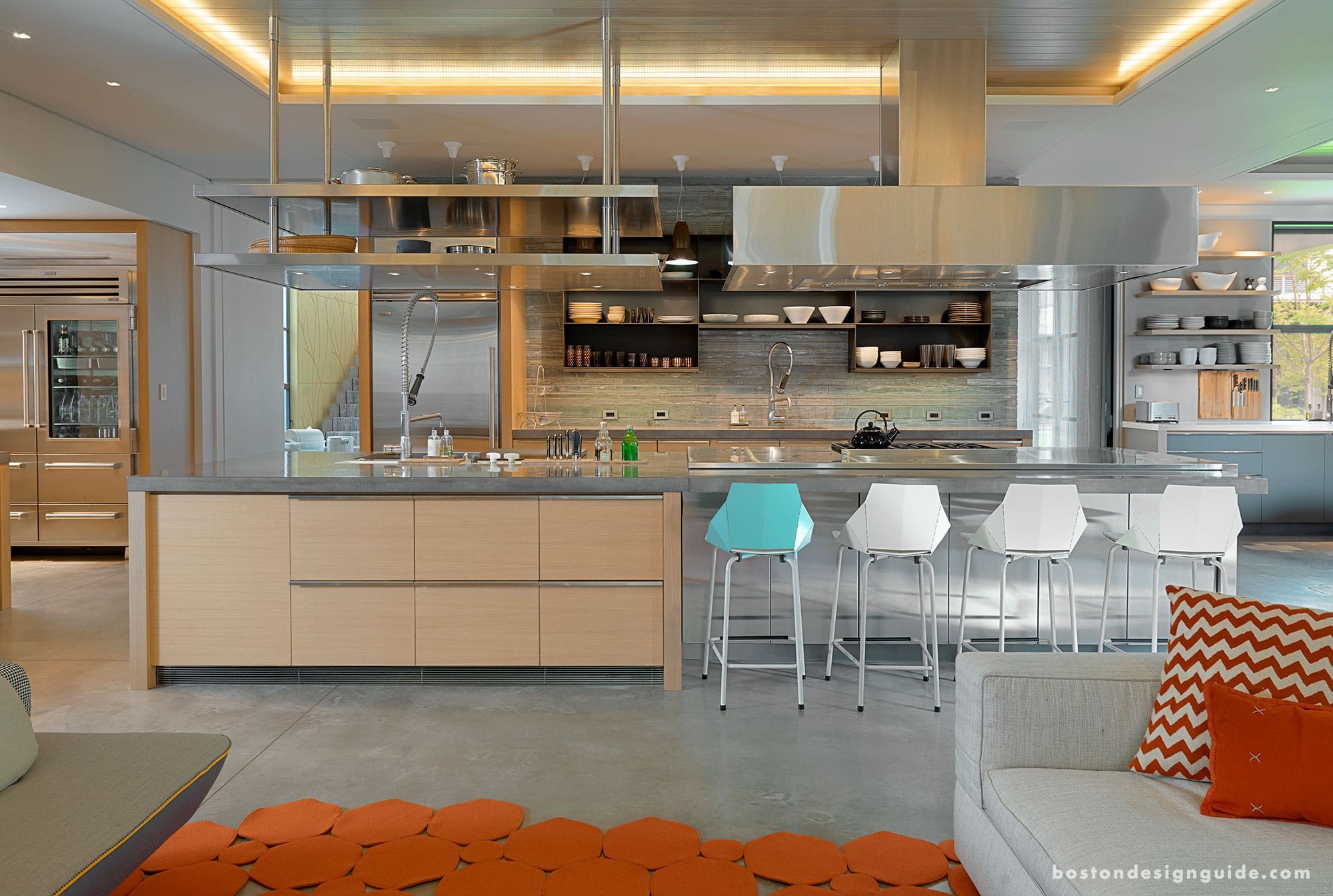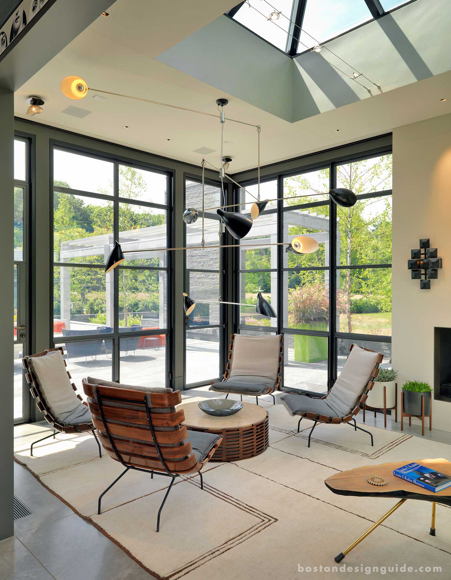 The streams of sunlight that pervade the open, airy interior settings keep the modern space from coming off as cold or stark. A neutral color palette and end grain wood block warm the concrete floors and minimal wall treatments for an industrial sensibility that still feels homey. A “less-is-more” feeling, as well as one of innate glamour is pervasive. Living spaces are set off by furniture arrangements and forms, metallics dance with one another, eye-catching works of art and lighting designs radiate in all directions, while supple fabrics and downy, piled rugs soften the hard edges.