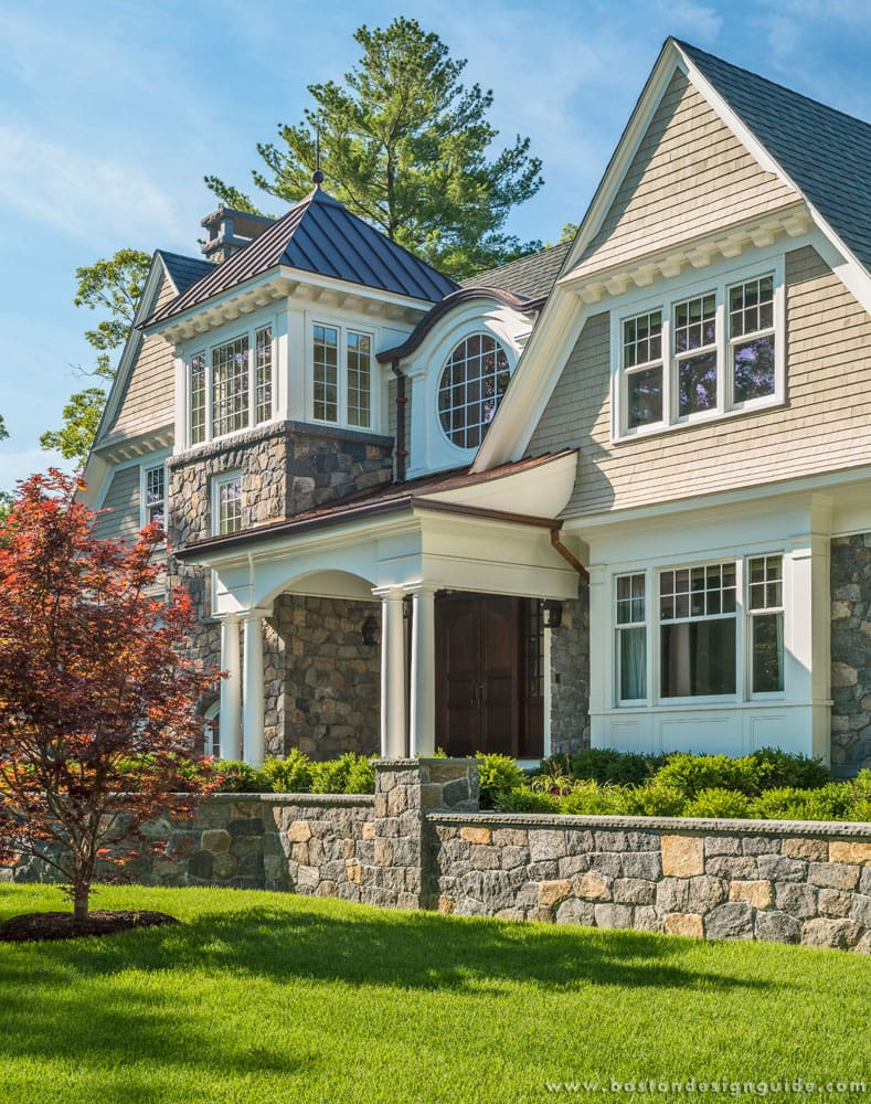 It’s the compilation of materials and how they work together that make the home timeless, explains Kaplan. The stone in particular; the broad use of New England fieldstone on the home itself and in the retaining walls just says “New England,” adds Kaplan. The homeowner took a vested interest in the stonework, and it paid off. He was discriminating about the size and color of the stones, even supervising the installation on a magnificent stair tower.