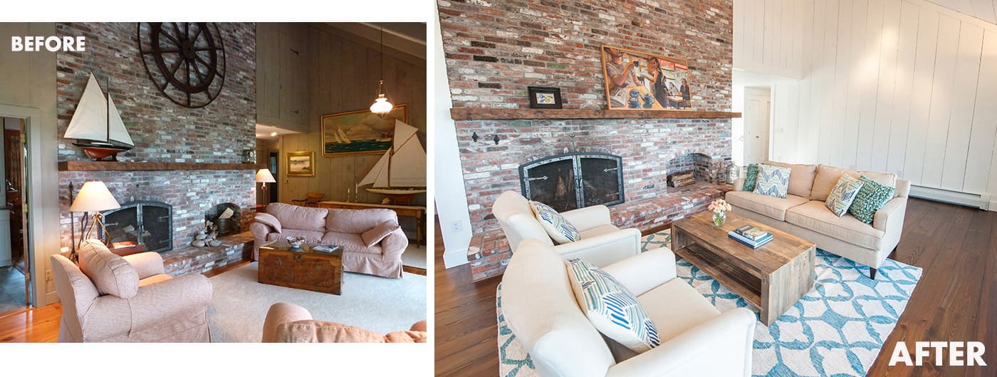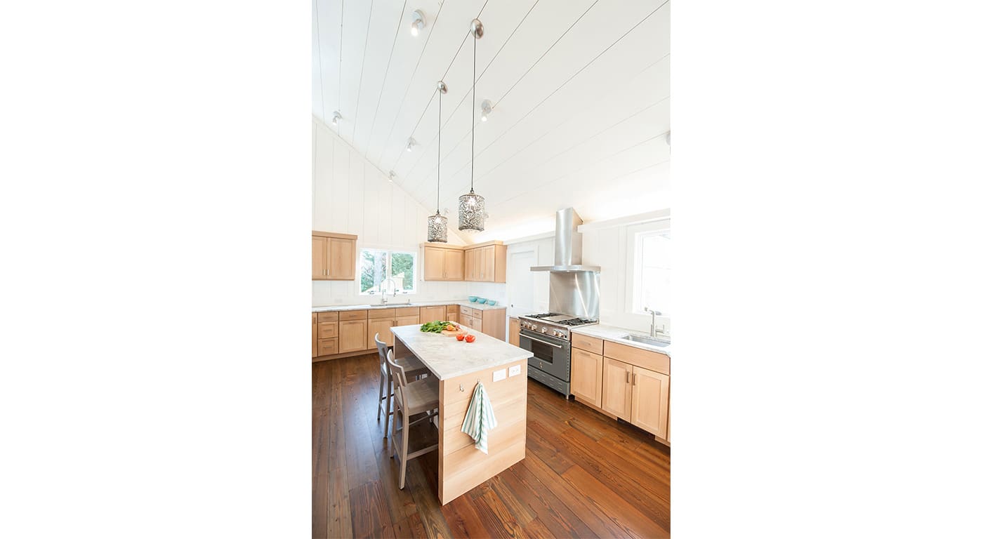 The massive center fireplace was further featured by opening up the kitchen ceiling and matching the bricks on the kitchen side to those on the living room side. The existing antique heart pine floors were stripped and stained a handsome darker brown to tone down their natural orange hues.