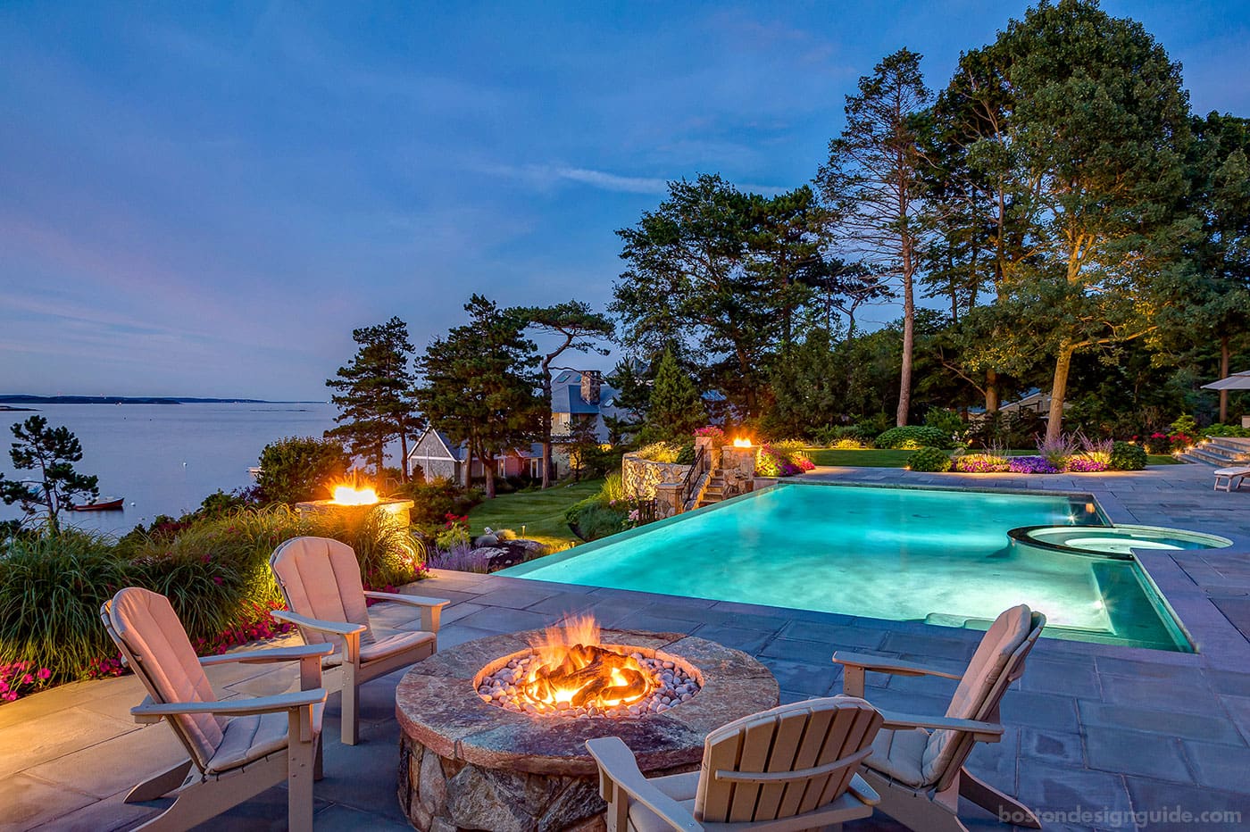 R.P. Marzilli & Company carved this family paradise with a seaside lookout from an existing terrain of slope and ledge. Breathtaking by night and by day, the outdoor living areas include a bluestone dining terrace, fire pit, infinity pool and dramatic fire piers that alight the pool wall.