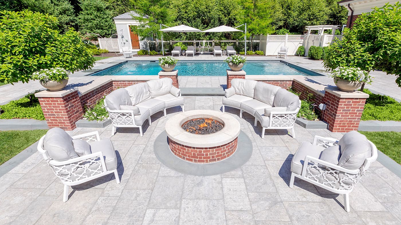 A sparkling pool terrace crafted by the Schumacher Companies is upbeat and refreshing with its Black Irish limestone (truly!), red brick and a circular fire feature. Arcing streams of water from custom spouts within the coping complete the effect, making a gentle splash.