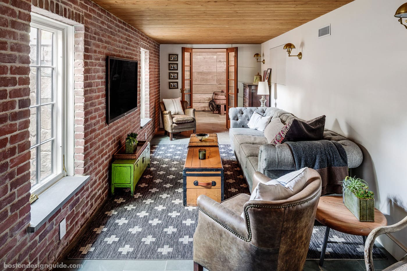 Brick was used in the basement to create the feel of an old home. Structural deck was used on the tongue and groove ceiling, as the floor was thinned to get more headroom. The wine room, seen through the doors, was crafted in reclaimed wood from upstate New York.