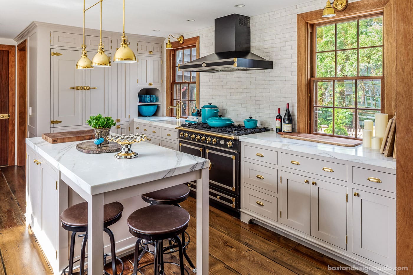The kitchen, a glorious mix of old meets new, resides in the “L” of the home.