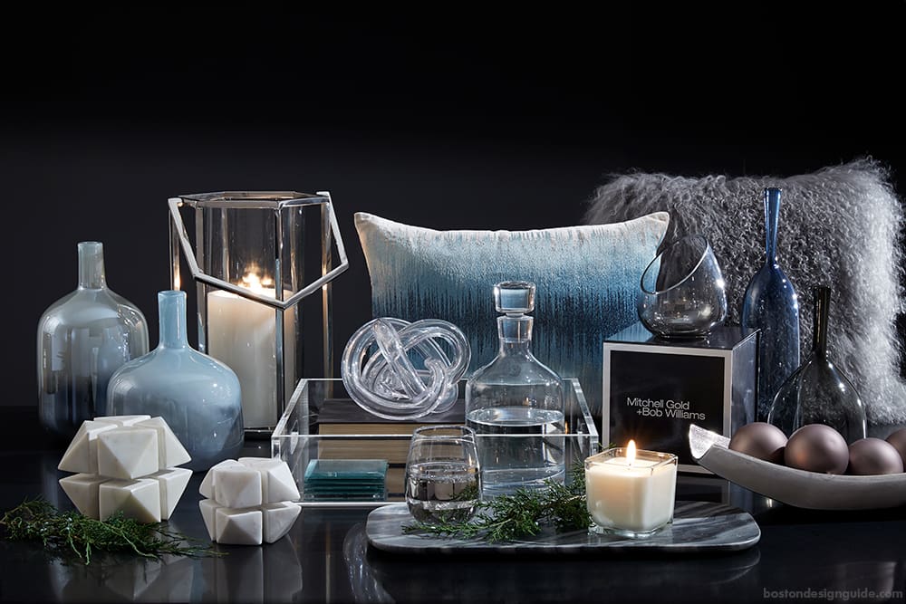 We’ve taken a shine to Mitchell Gold + Bob Williams' Hexagonal Hurricane, pictured above with an array of dashing home accents including ombre vases, a marble cheeseboard, a glass decanter and the company’s signature candle. The luminous lantern makes a chic focal point on the mantel (surrounded by pine, of course), or as the centerpiece on your holiday table.