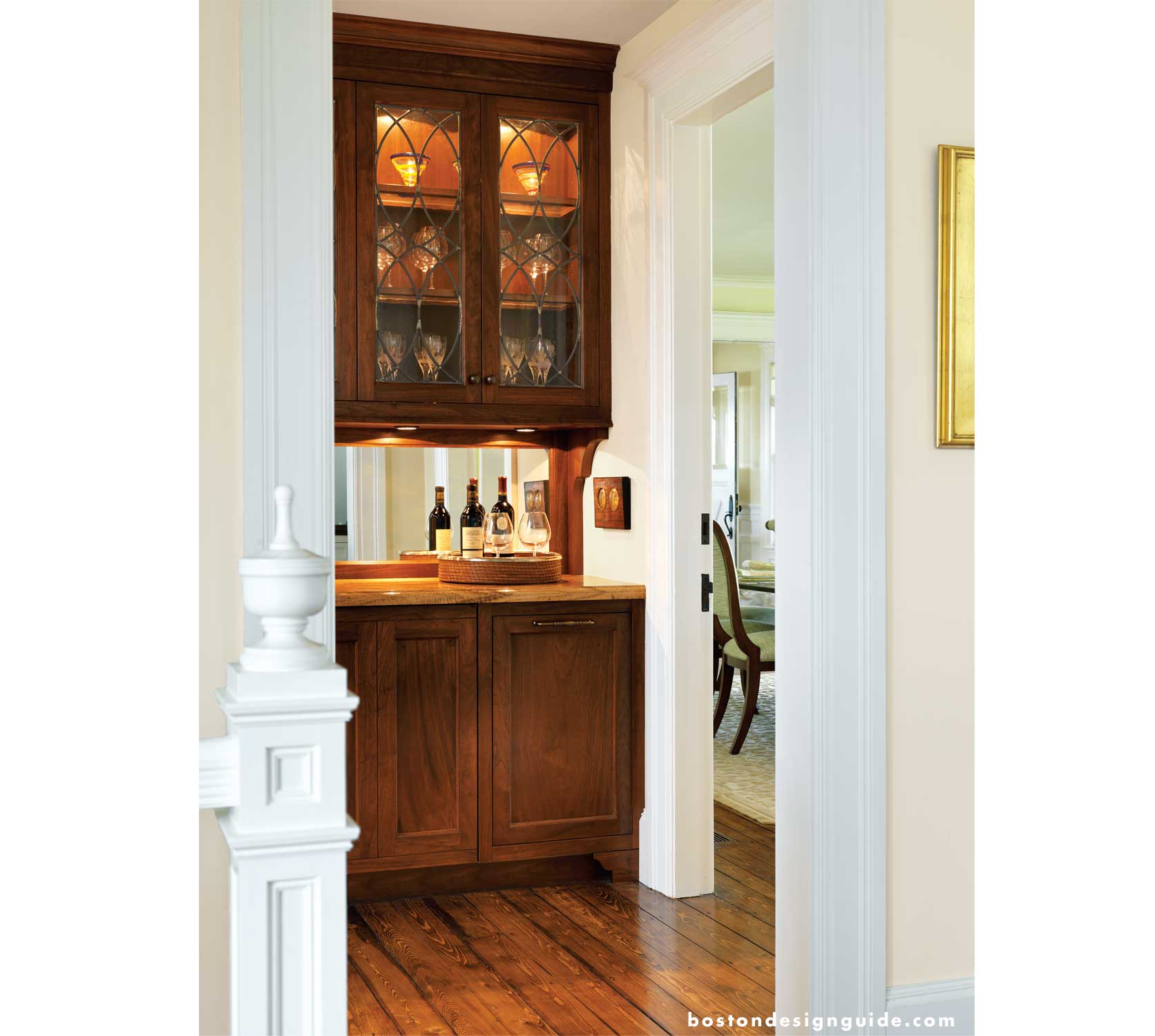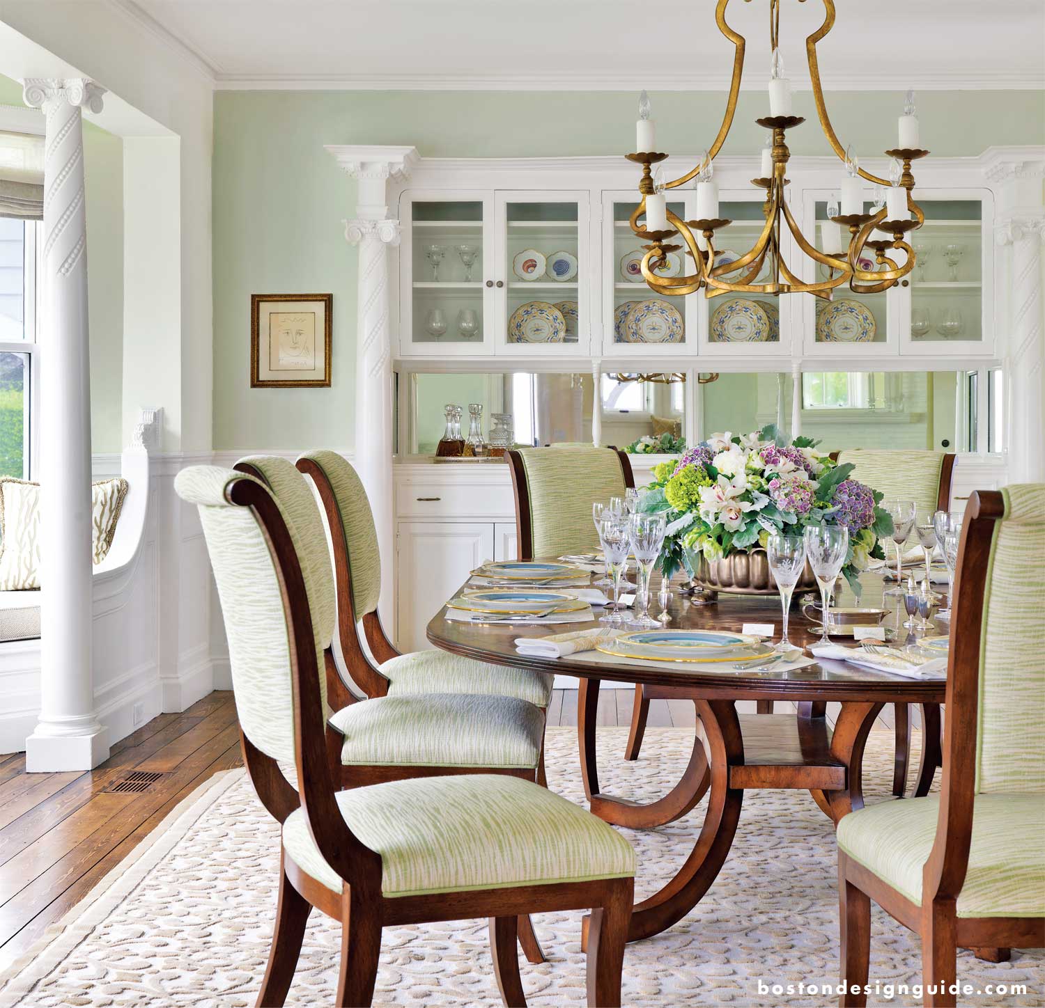The dining room was elegantly restored and has built-in cabinets