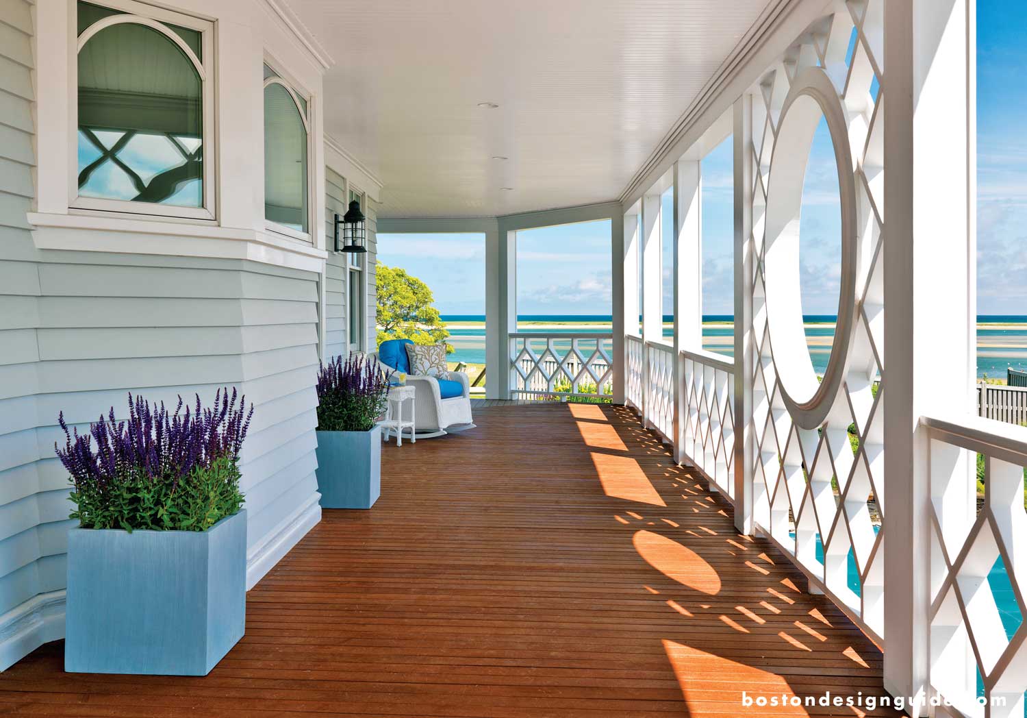 Kotzen reconfigured six third floor windows on the front of the house the give the house a nautical look. “No one liked the trapezoid-shaped window under the front roof peak, so I had it removed and designed a new window that looks like a ship’s wheel,” she says. Kotzen also designed the custom cabinetry throughout the house including all of the bathroom vanities, with the help of Stephen Terhune Woodworking.