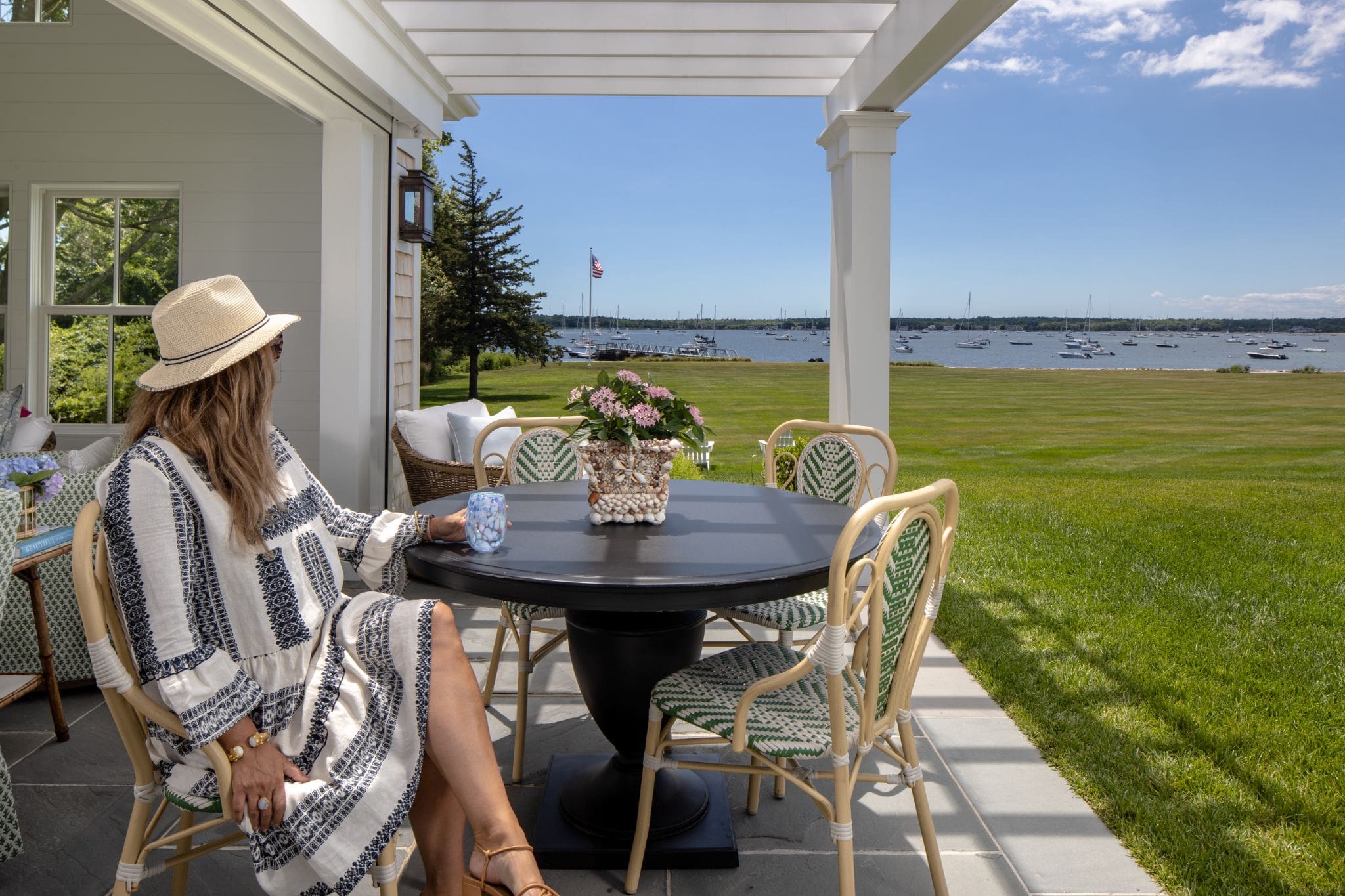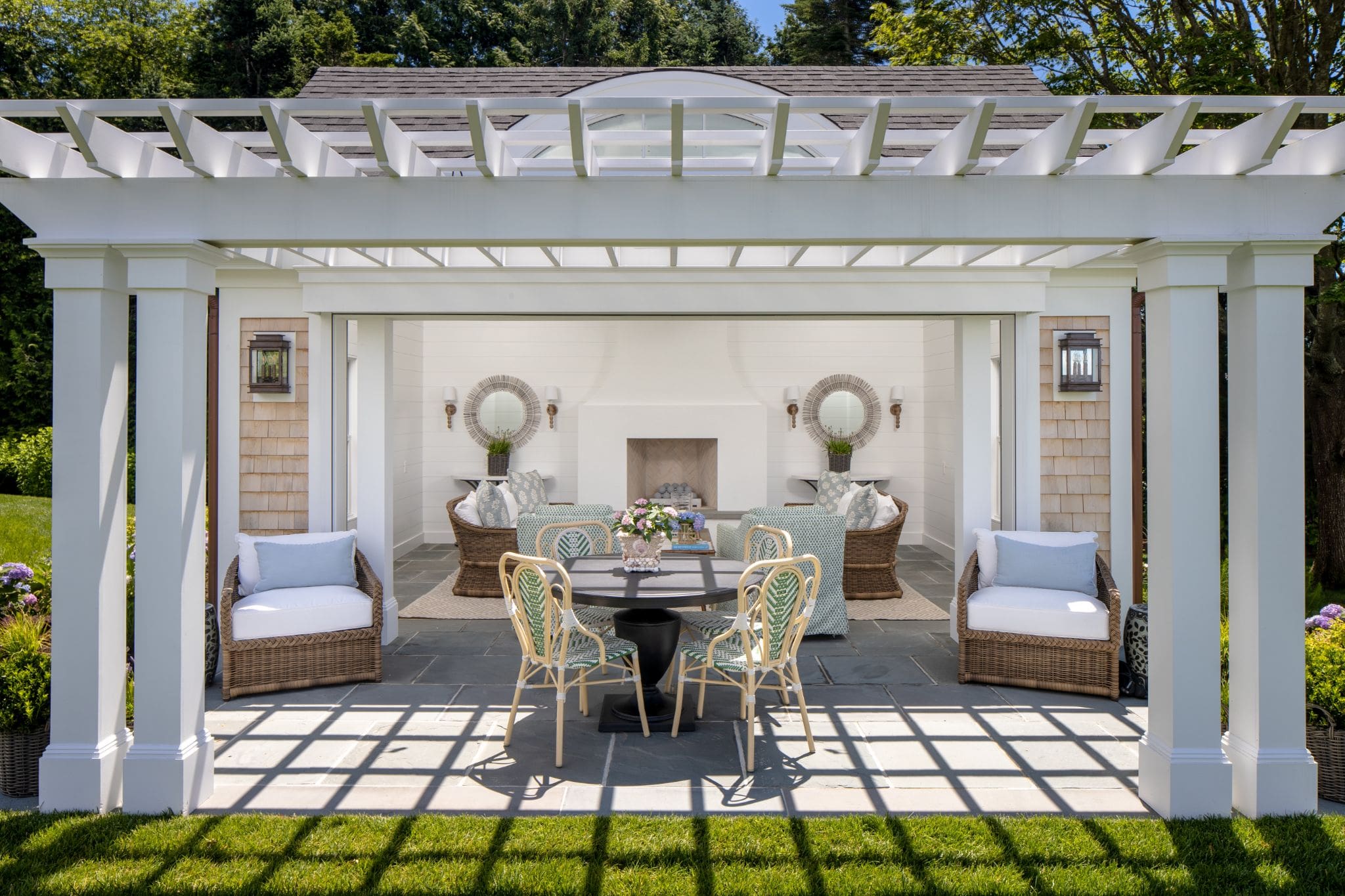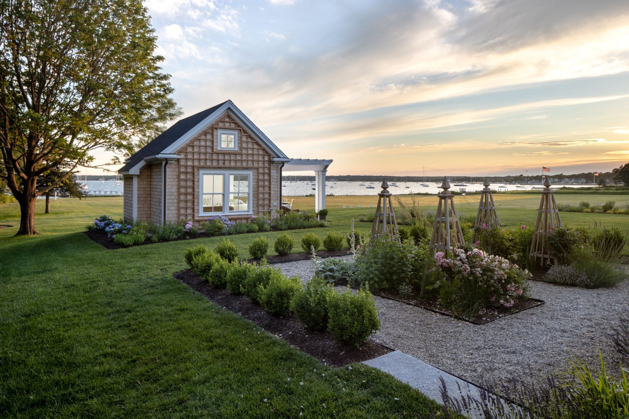 The Texas clients, a family with grandchildren to entertain, envisioned a haven to enjoy during the summers. They nestled into their Mattapoisett vacation home in the summer of 2020, but still felt it needed something. They opted out of getting a pool for the property, and instead added a separate tea house in the gardens, one with a breathtaking view of the water and the whole town.