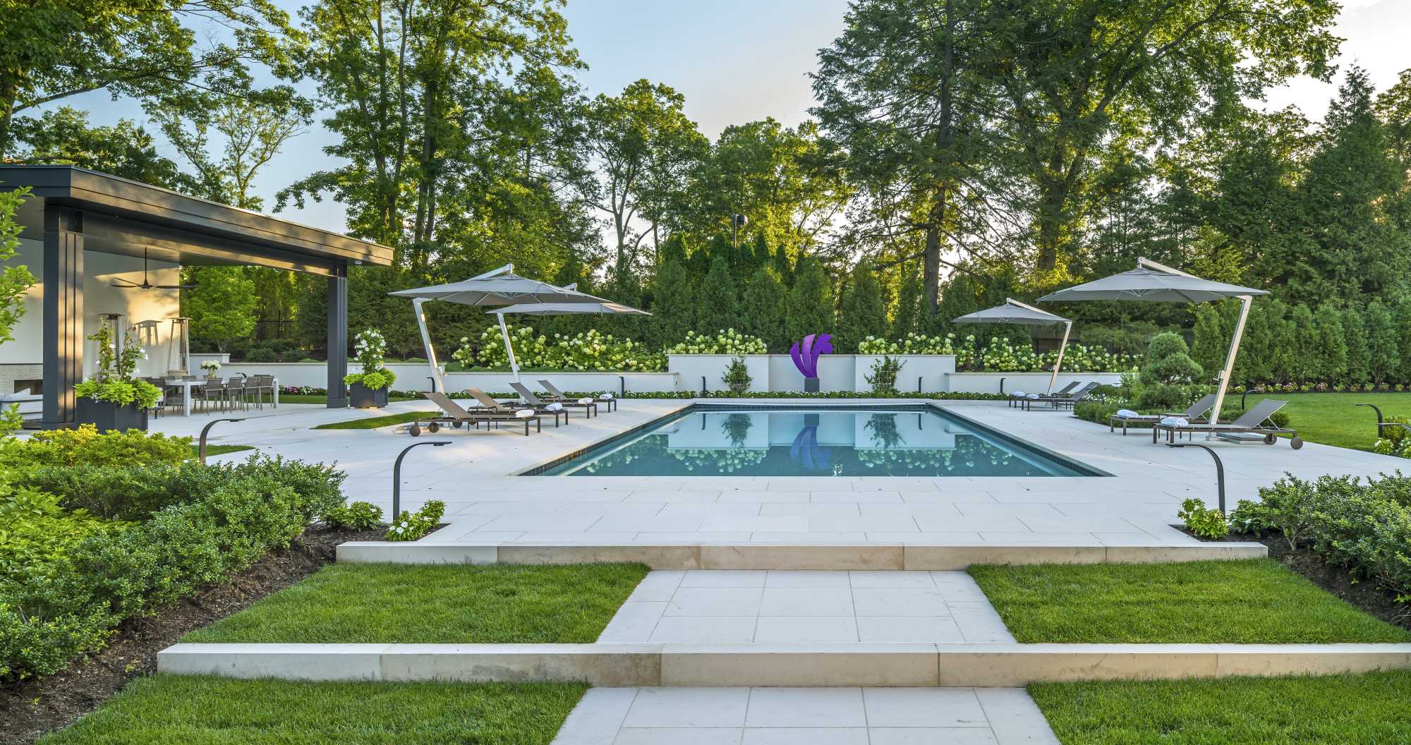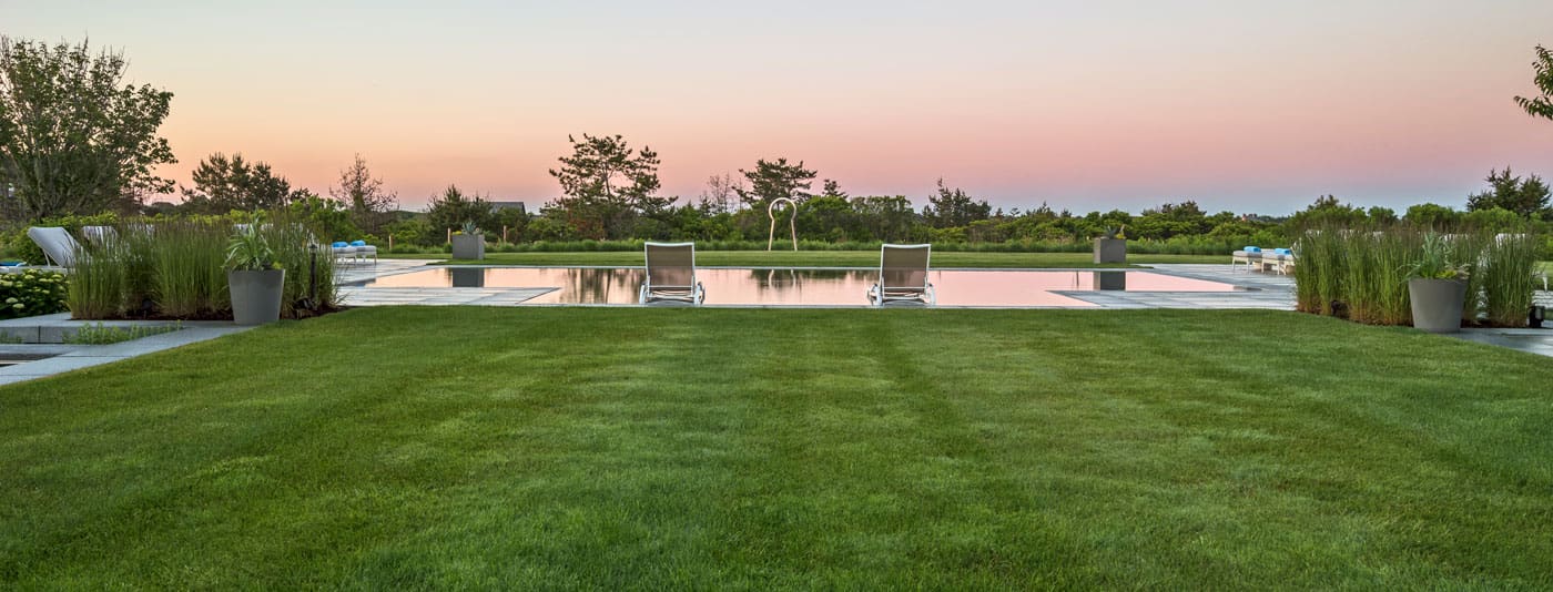 This peaceful pool terrace by Dan Gordon Landscape Architects is an integral part of the lauded firm’s 2019 Bulfinch-Award winning landscape design. Nestled within the lawn terrace and nearby meadow, it is captivating for its symmetry and unassuming splendor.