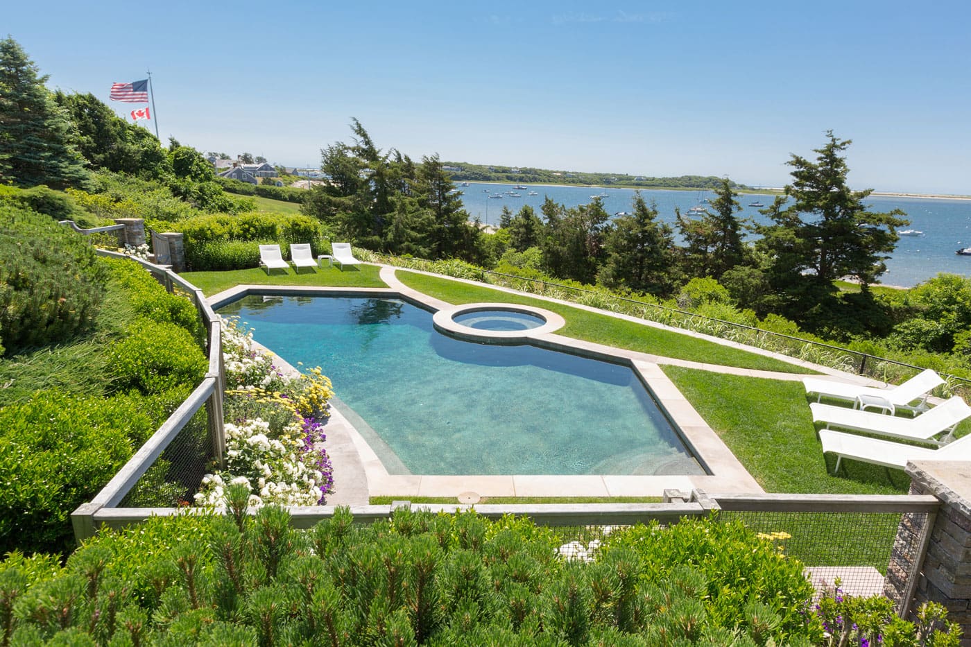 This blissful pool terrace within a coastal compound in Nantucket conceived by Gregory Lombardi Design Incorporated drinks in the sky and the peace of its environs. With bands of granite and Valders Stone limestone, this stunner boasts a linear style and sun shelf at its crown.