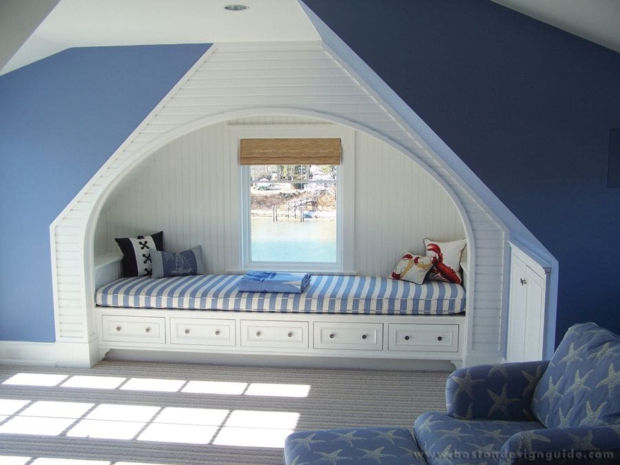The striped perch of a beachside alcove constructed by E.W. Tarca Construction, Inc. is an ideal setting for a nap post-patriot games. The blue tones of the space are breezy and coastal in spirit, as is the starfish pattern of the chaise’s upholstery.