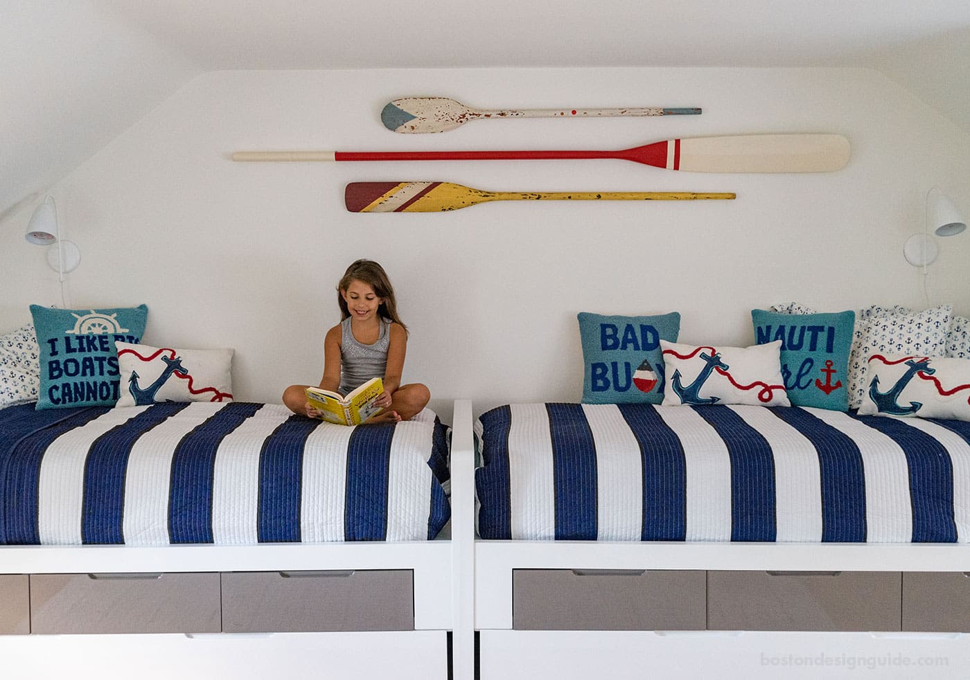 The twin bunks of a lively bedroom—designed by Martha’s Vineyard Interior Design, with architecture by Hutker Architects—give stripes a starring role. We salute the sea-worthy scene, high-flying oar décor, sassy pillow talk and stow-away built-ins that make the room an inspired port of call.