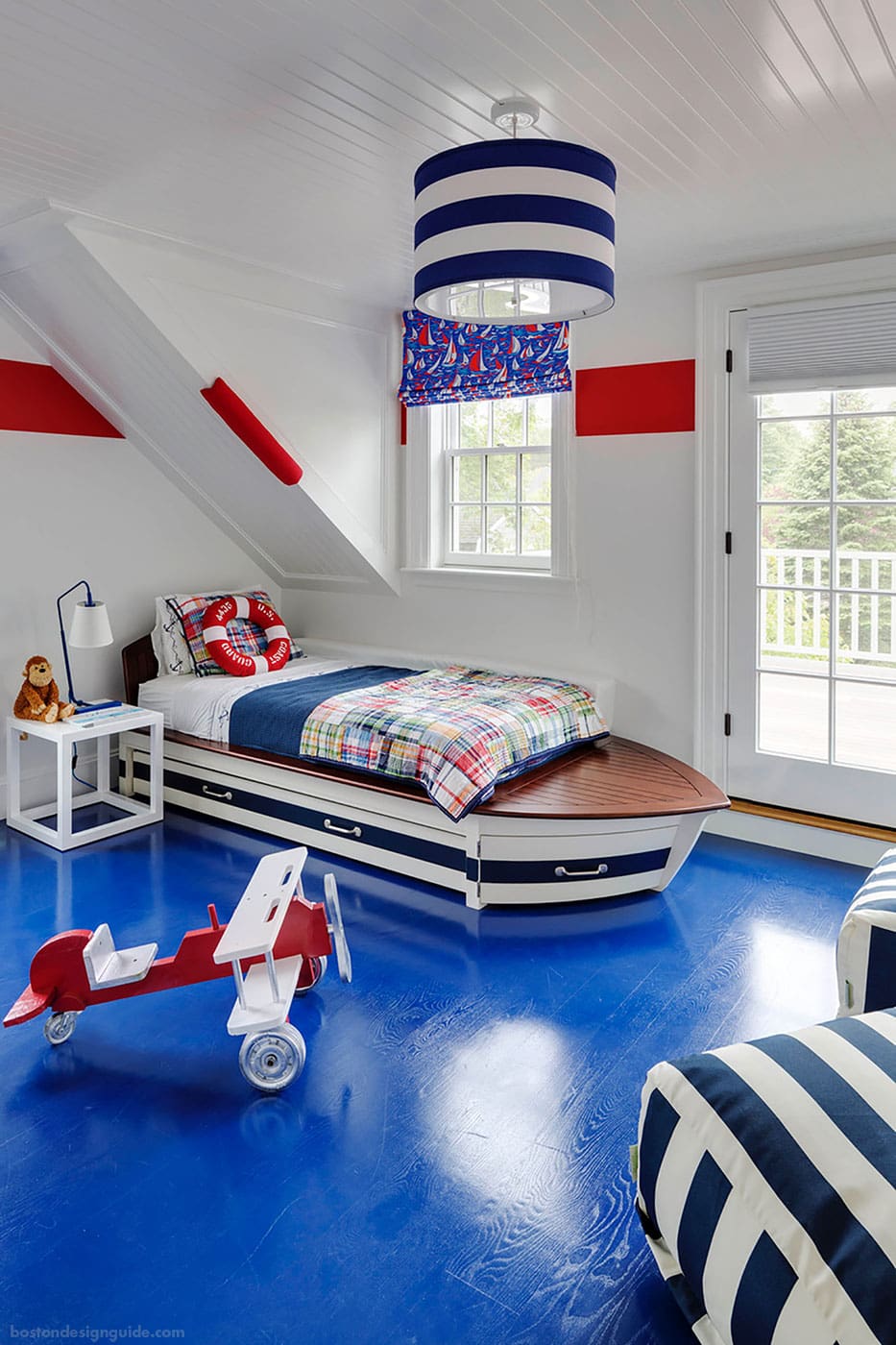 This children’s bedroom of a cottage in Edgartown, designed by Patrick Ahearn, FAIA of Patrick Ahearn Architect, really shows its stripes. We love the navy and white detailing on the boat-styled bed, drum fixture and upholstery. The look is dynamite alongside the broad red stripe that emblazons the wall, and the field of shiny bright blue on the flooring.
