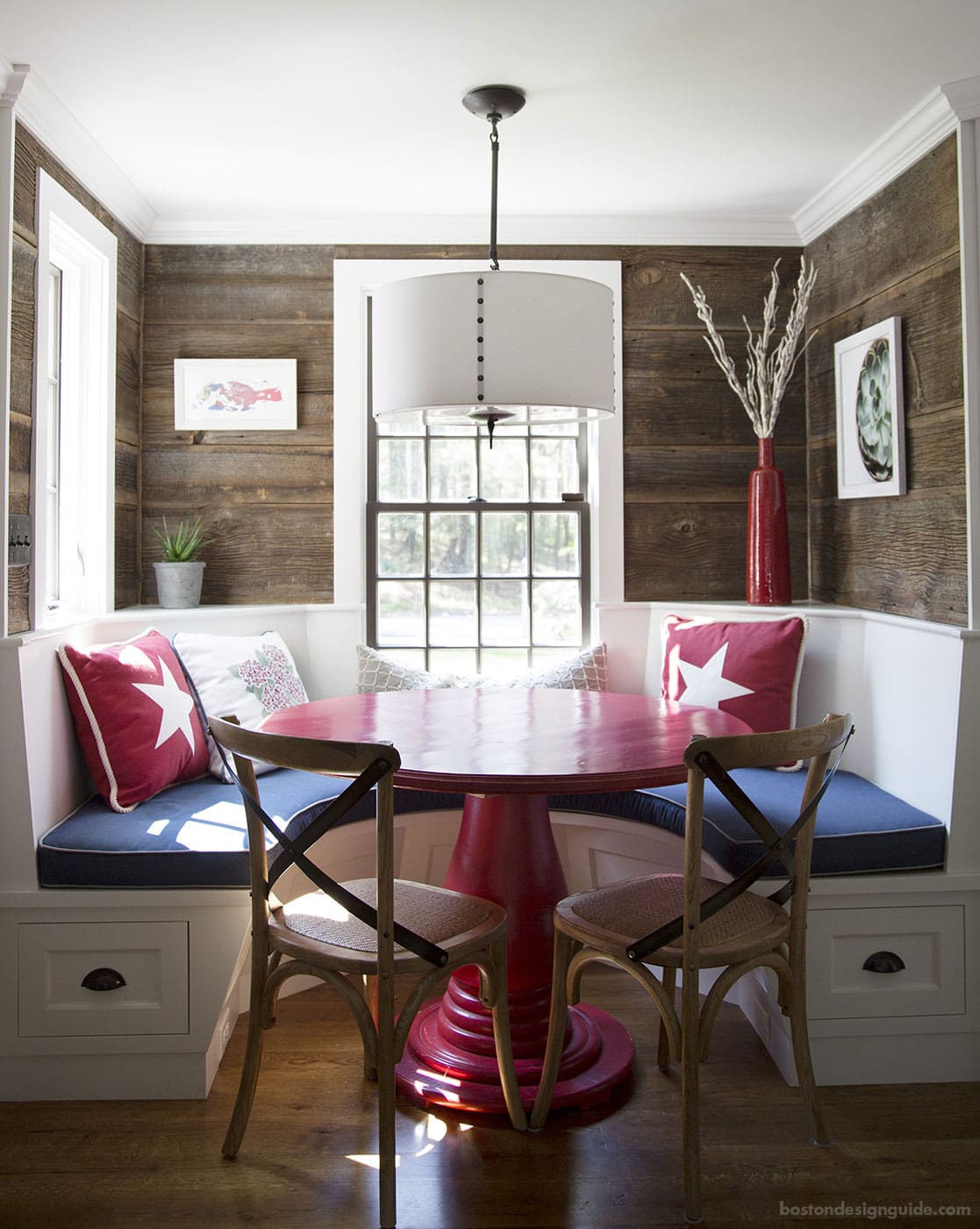 Every day is Flag Day when gathered at the table of a beautiful bespoke eating nook in a home constructed by brookes + hill custom builders, inc. This space is bold and proud with its white built-in banquette seating with royal blue cushions, take-notice red pedestal table and star-spangled pillows.